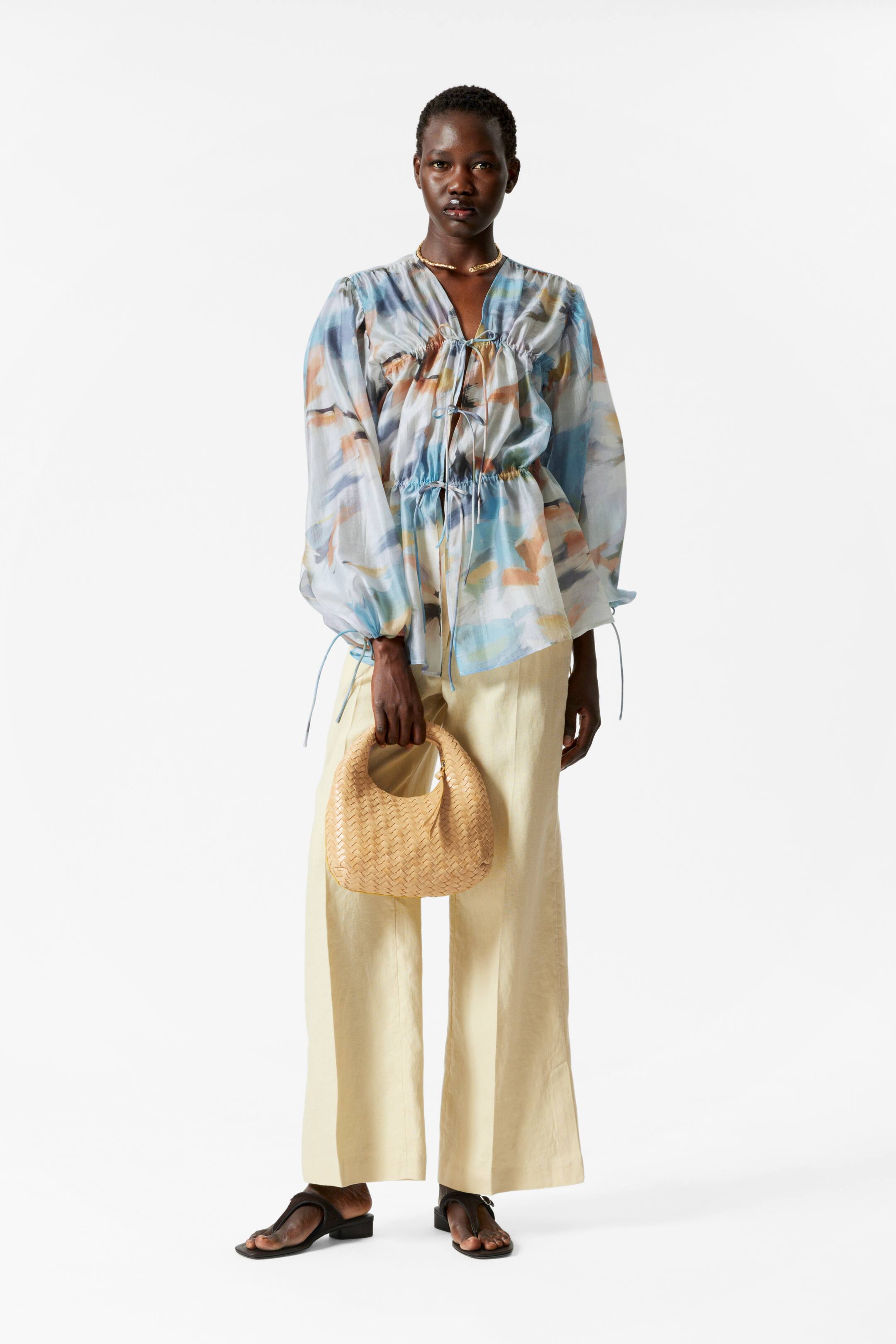 Realizzata in tessuto leggero, questa blusa presenta silhouette ampia con baschina, scollo a V e delicate chiusure con lacci sul davanti che creano un effetto arricciato. Le maniche lunghe sono voluminose, con coulisse regolabili ai polsi per una vestibilità personalizzata. Lunghezza della blusa:69 cm (taglia S)