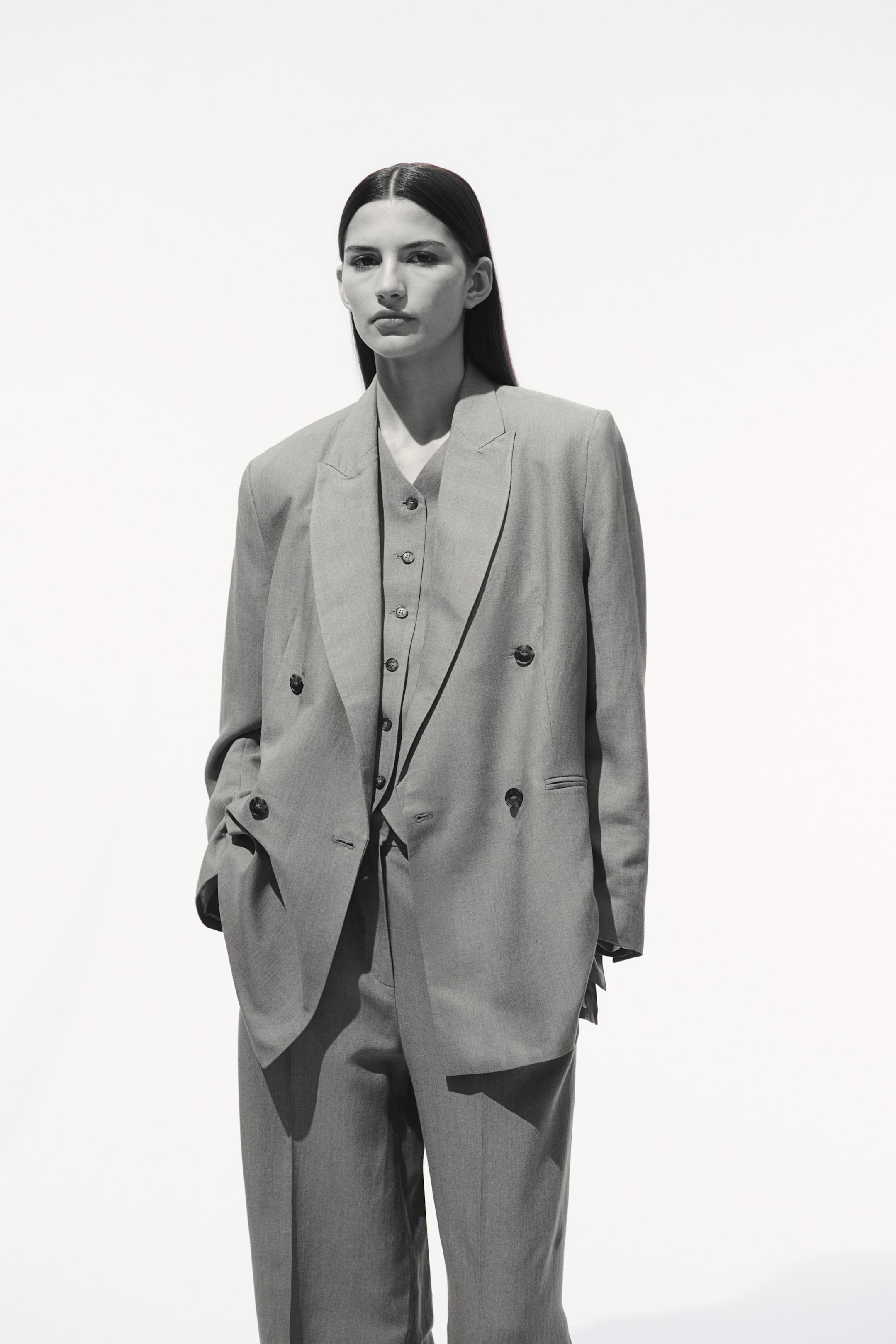 Blazer lungo a doppio petto in tessuto. Revers a punta, bottoni davanti. Spalle imbottite, polsini con spacco e bottoni. Tasche anteriori a doppio filetto e una tasca interna con bottone. Doppio spacco dietro. Foderato.