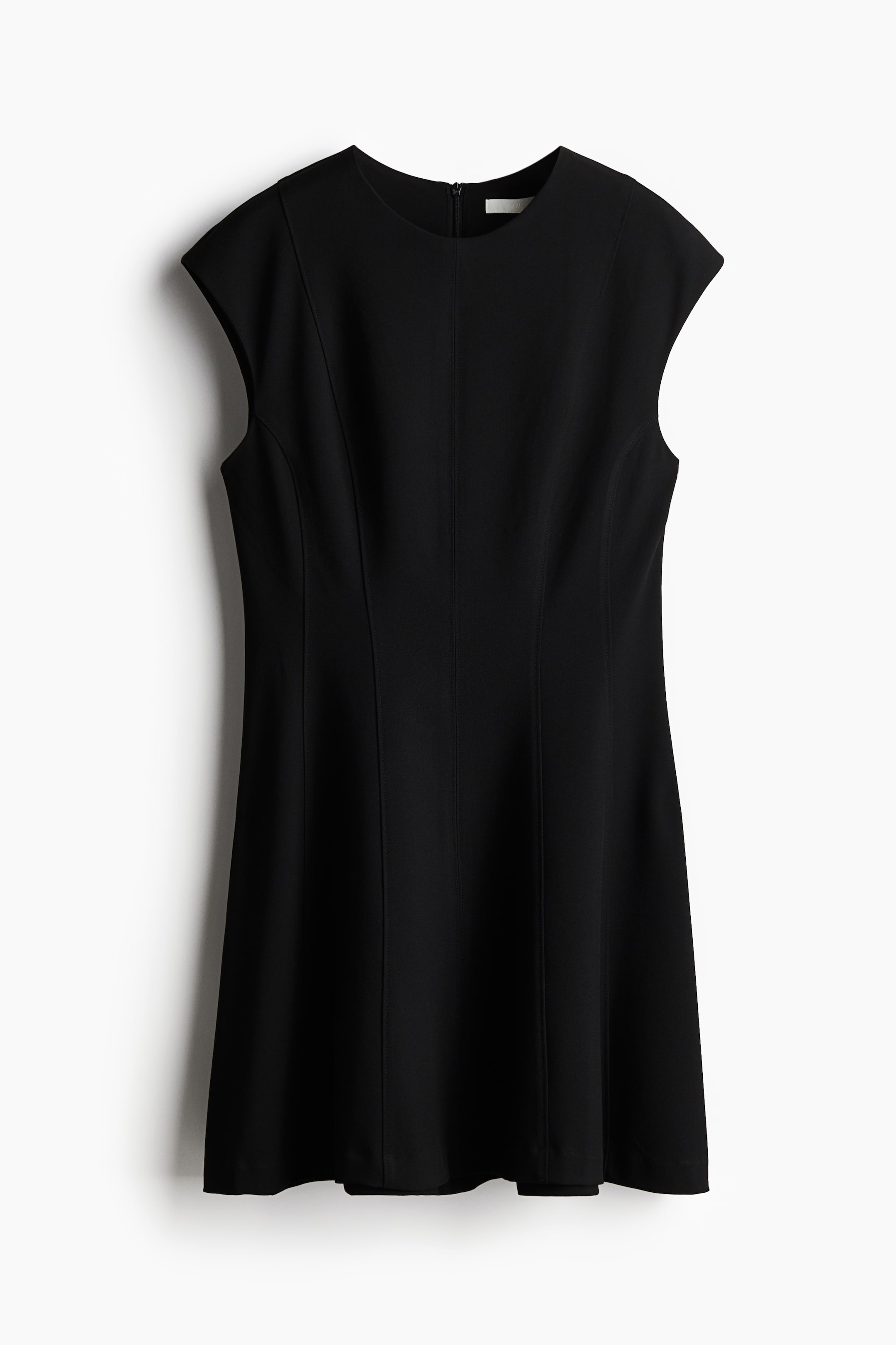 Abito corto in twill leggermente elasticizzato. Cuciture a vista davanti e dietro. Scollo rotondo, maniche ad aletta, cerniera nascosta dietro. Vita sciancrata, gonna svasata che dona eleganza alla silhouette. Sfoderato.