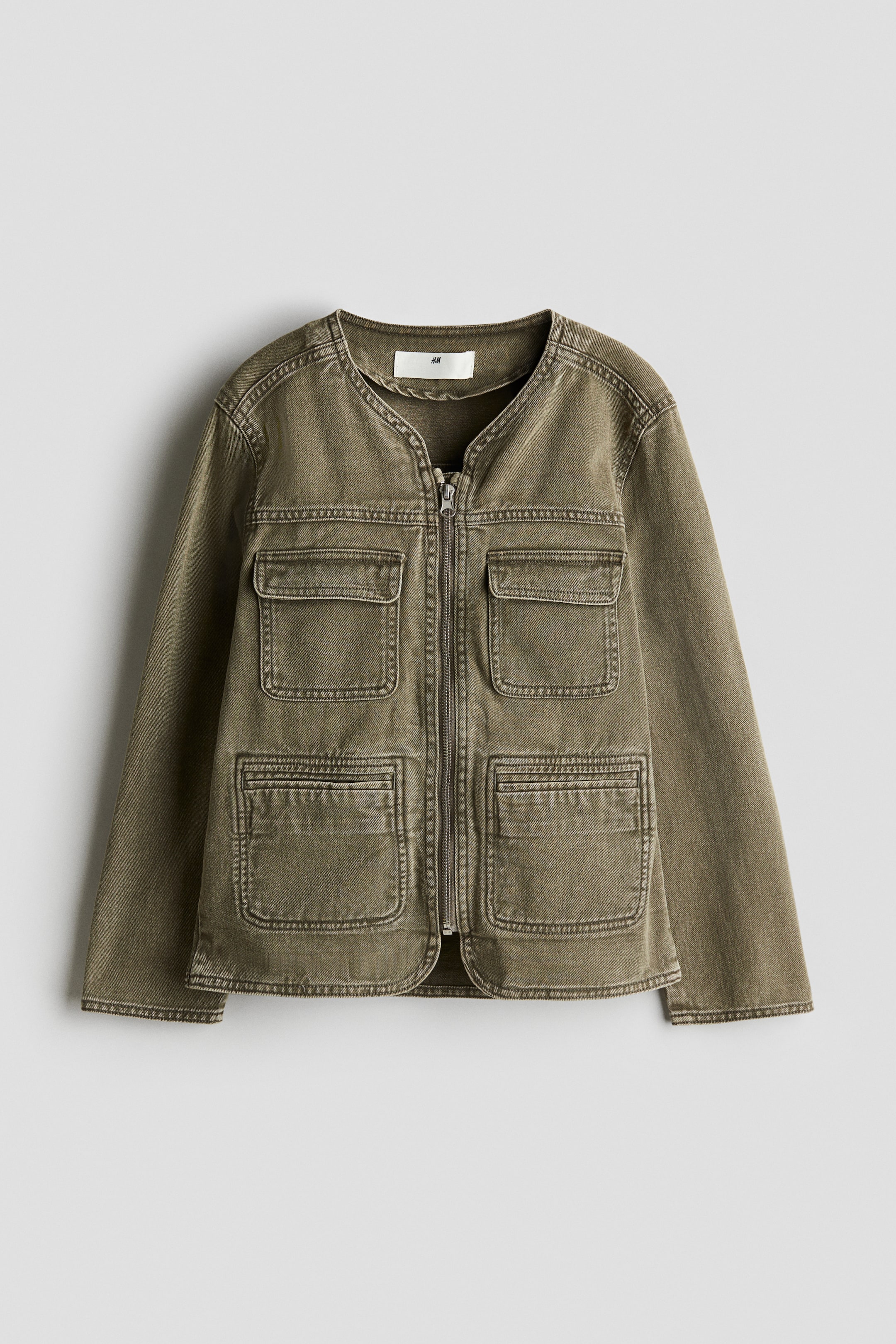 Giacca-camicia in twill di cotone senza colletto. Cerniera davanti, taschini con pattina e tasche davanti a doppio filetto. Bordo inferiore arrotondato davanti.