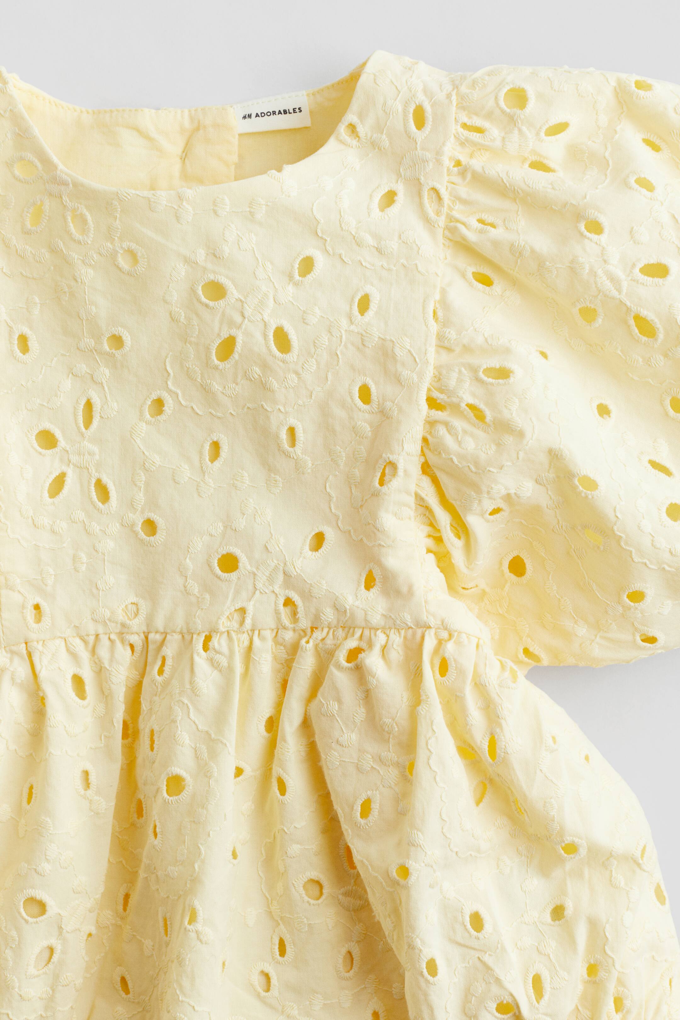 H&M Adorables. Pagliaccetto in leggero tessuto di cotone di alta qualità con sangallo. Scollo rotondo, carré dal taglio stretto. Maniche voluminose a sbuffo con elastico rivestito in fondo. Apertura con bottoni sulla nuca, arricciature in vita. Bottoni automatici in fondo per facilitare il cambio. Morbido elastico sottile sul girogamba. Parzialmente foderato.