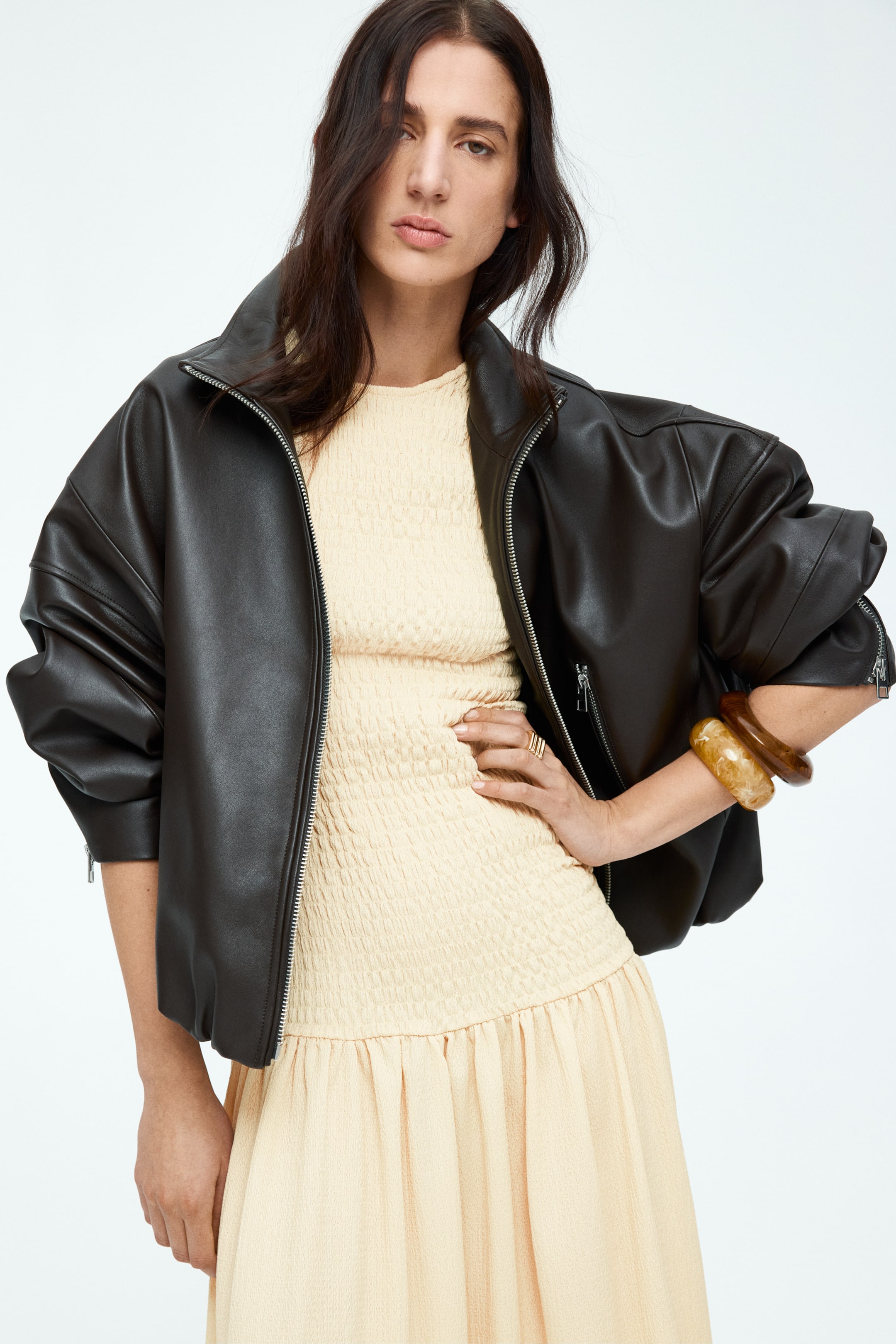 Maxiabito senza maniche in jersey strutturato. Corpetto a smock e gonna leggermente svasata.