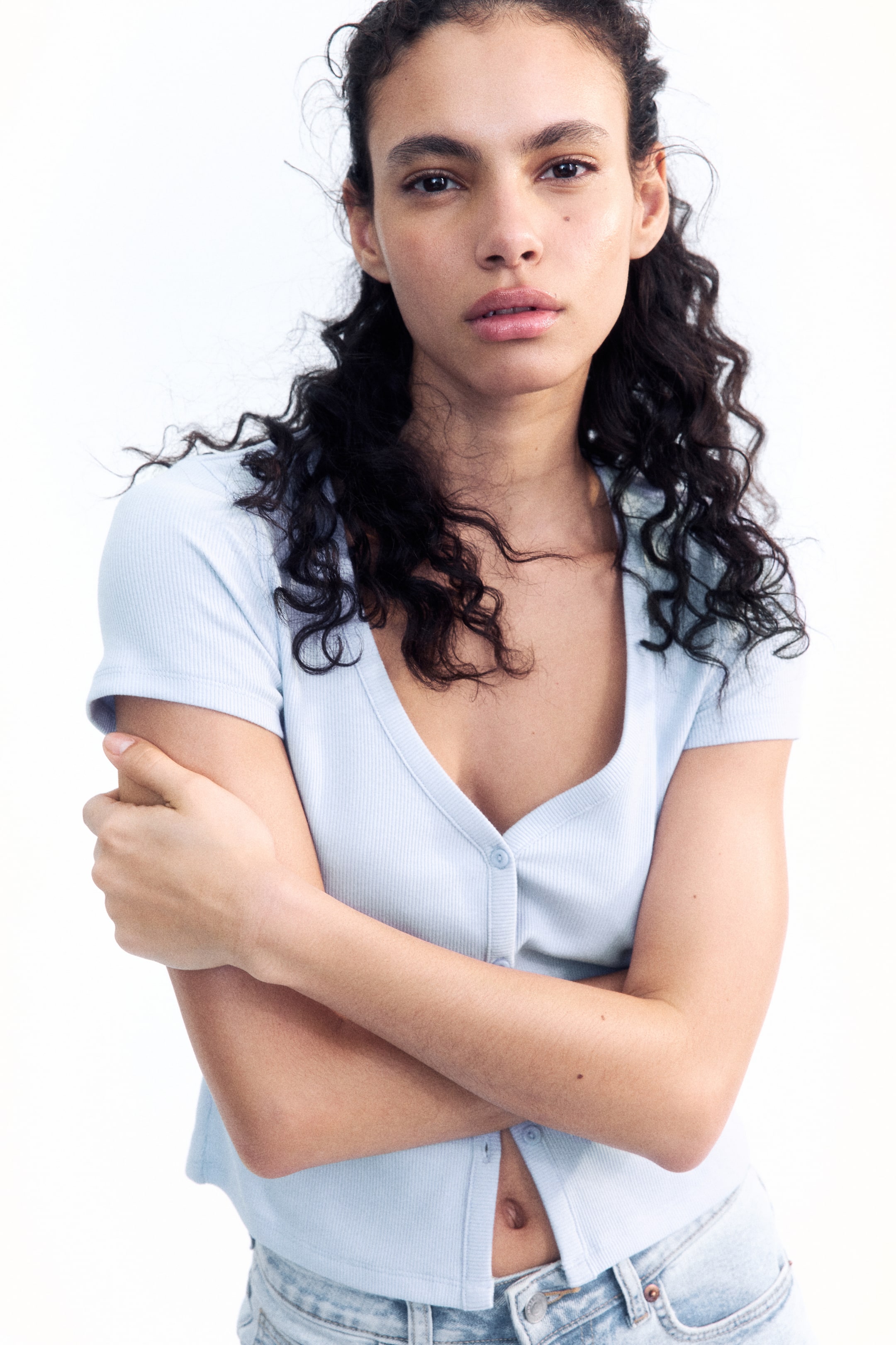 T-shirt aderente in jersey di cotone a coste. Profondo scollo a V, bottoni davanti e bordo dritto in basso.