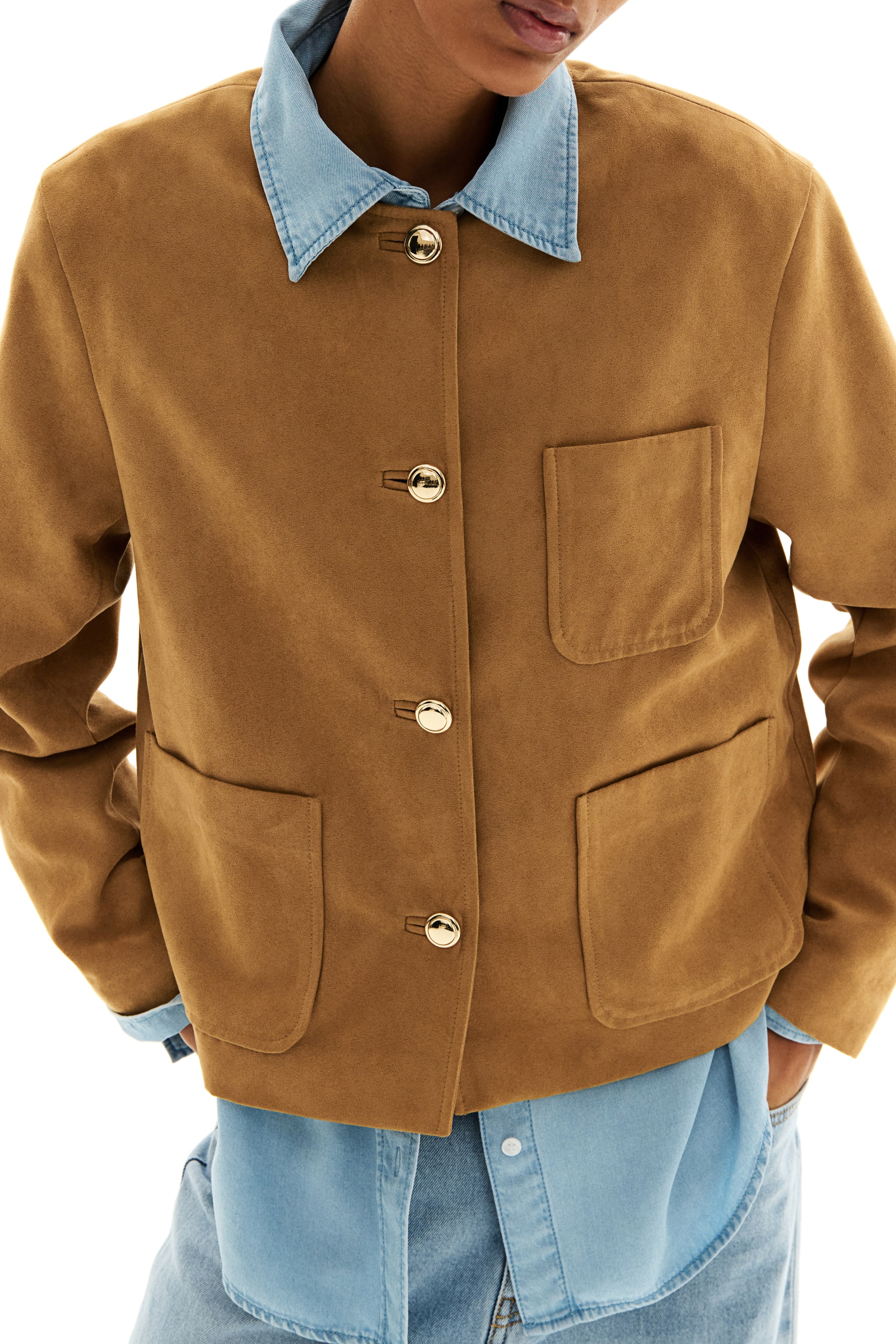 Giacca dalla linea squadrata in tessuto con morbida finitura nappata. Scollo rotondo, bottoni in metallo davanti. Tasche applicate sul petto e davanti. Foderata.