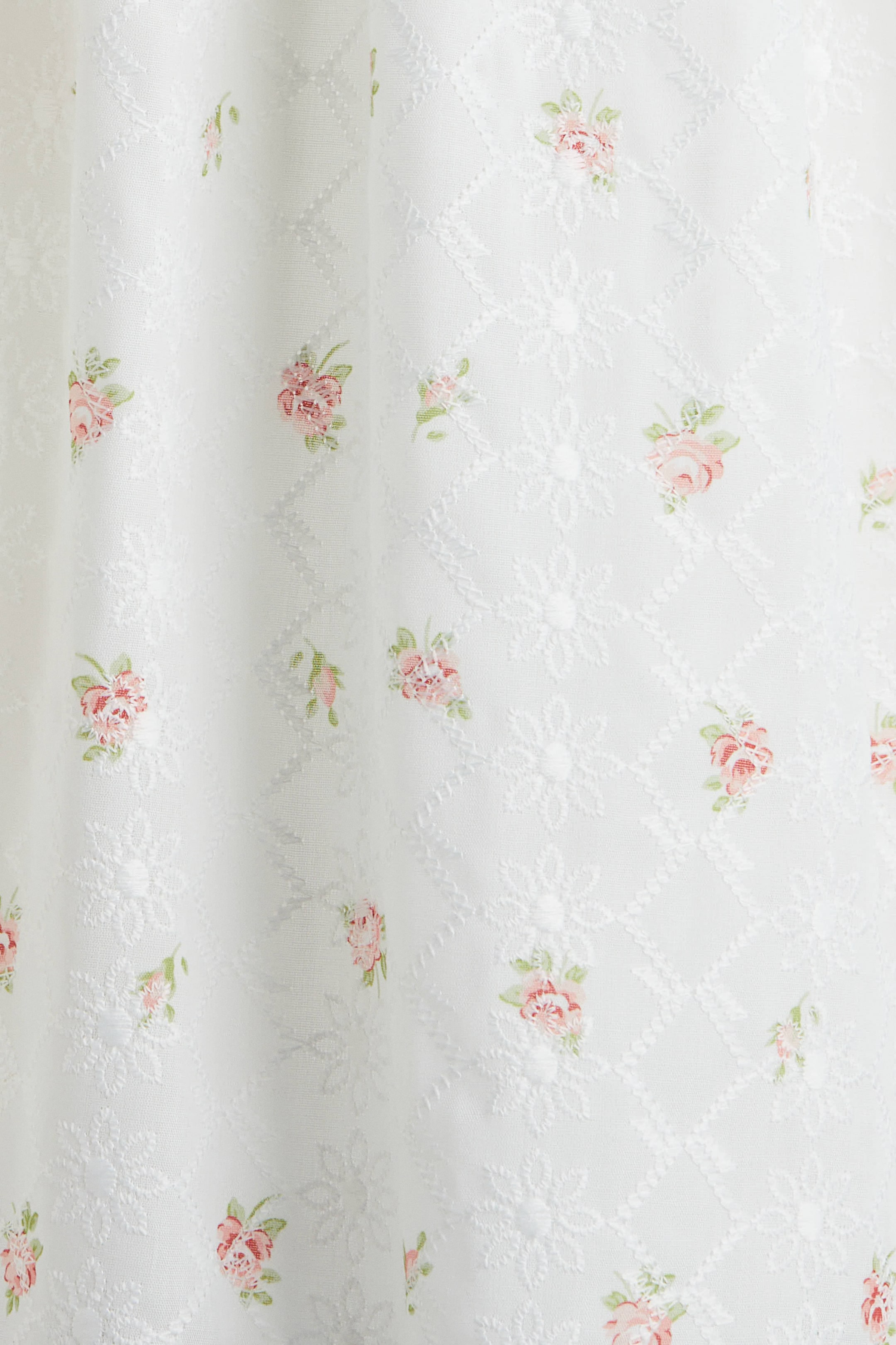 Abito corto in tessuto con motivi ricamati all-over. Corpetto aderente con scollo rotondo e cerniera nascosta su un lato. Schiena scoperta con laccetti sottili da annodare dietro la nuca. Maniche a sbuffo con lunghezza al gomito. Cucitura arricciata in vita, gonna leggermente svasata. Foderato.