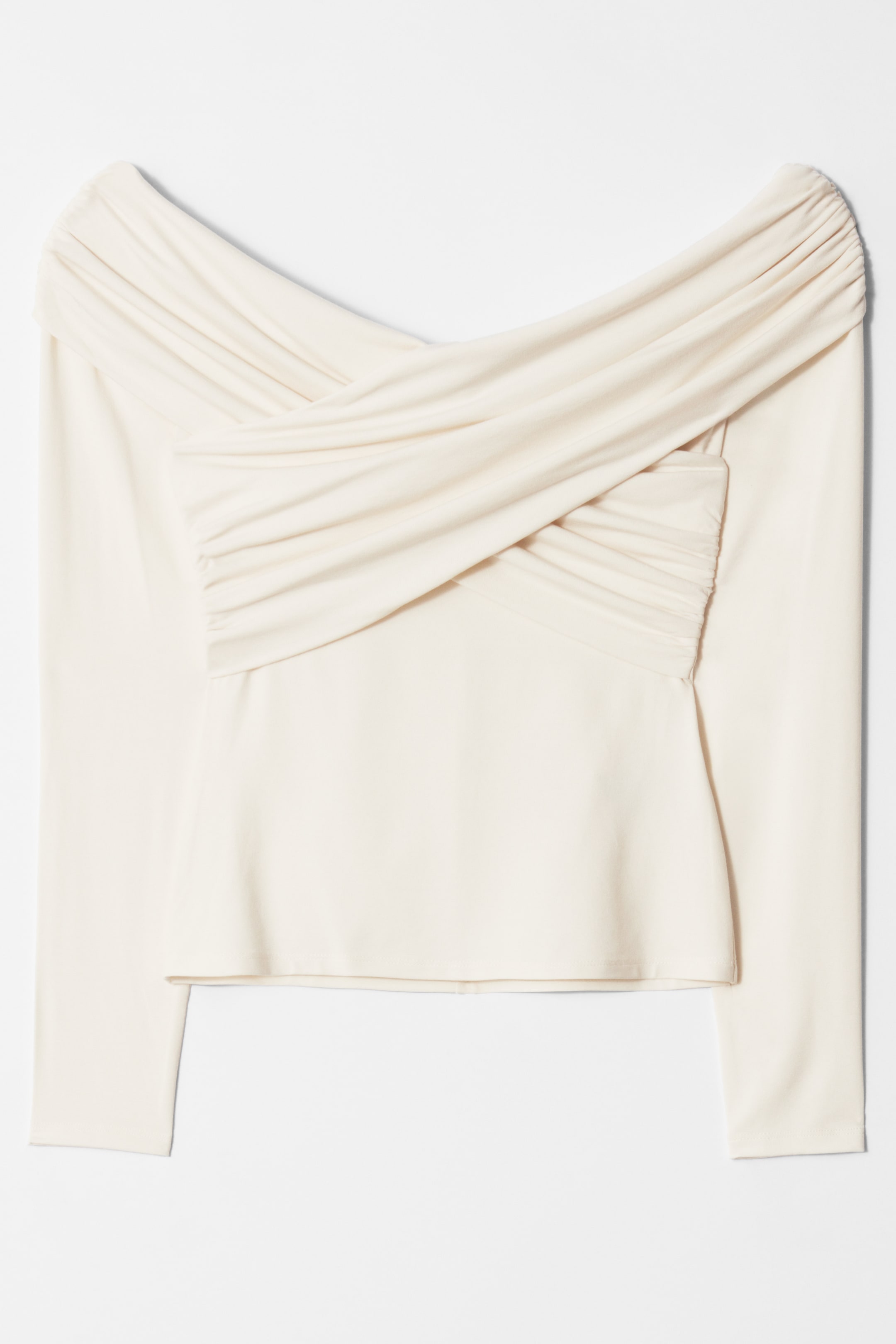 Questa maglia a maniche lunghe con spalle scoperte presenta uno scollo asimmetrico incrociato enfatizzato da arricciature drappeggiate. • Vestibilità slim Lunghezza della maglia: 41,5 cm (taglia S)