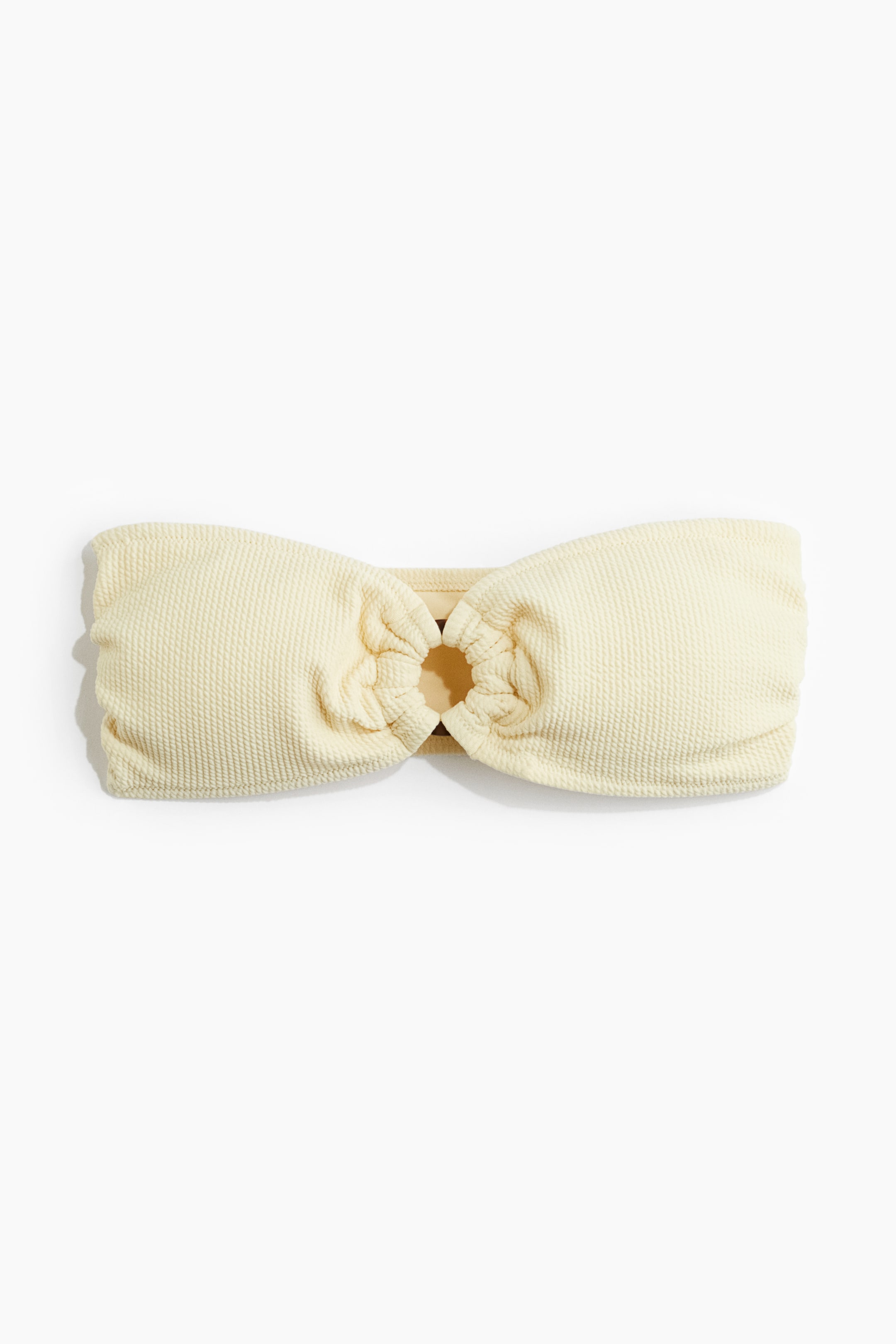 Top per bikini a fascia. Coppe con inserti removibili che modellano il seno e offrono un buon sostegno. Foderato. Bordo in silicone nascosto in alto, stecche di sostegno laterali e anello decorativo in plastica al centro del busto. Senza allacciatura.