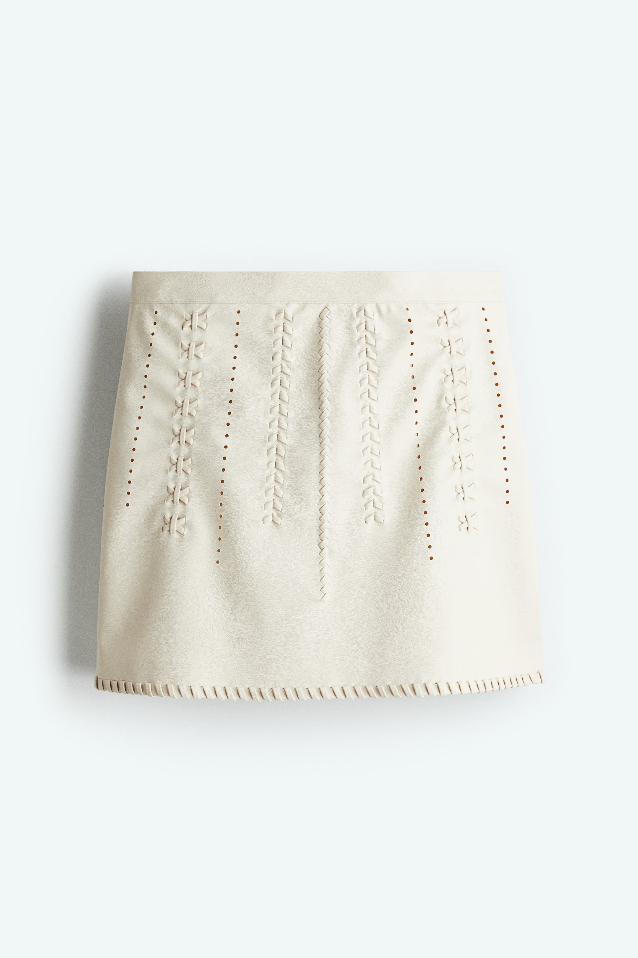 Gonna corta e aderente in tessuto coated con impunture intrecciate e piccoli trafori. Vita alta con cerniera dietro. Foderata.