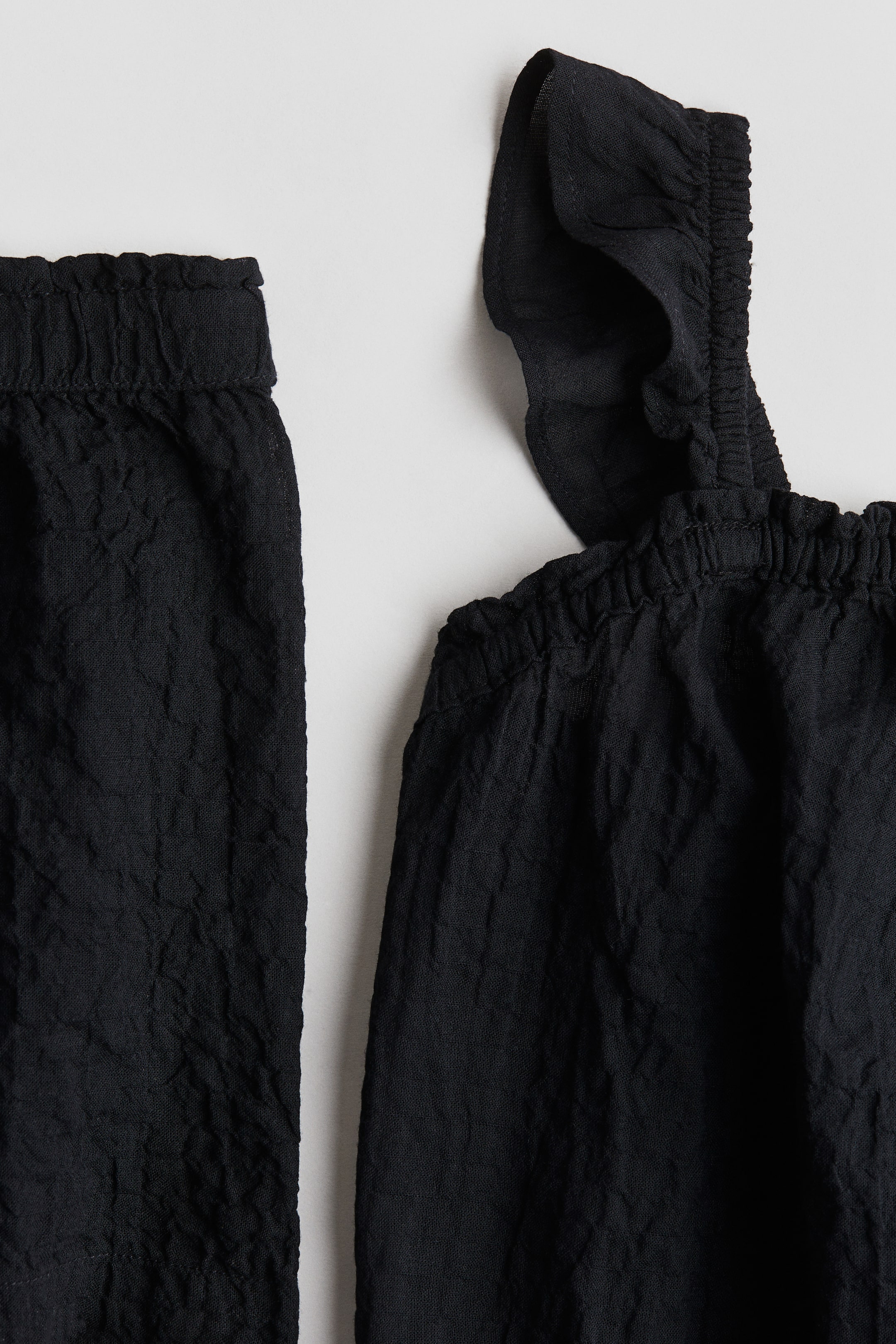 Set composto da top e shorts in leggero tessuto di cotone goffrato. Top con spalline bordate di volant. Scollo quadrato, elastico rivestito e bordo di volant sullo scollo e in basso. Shorts con elastico e bordo di volant in vita.
