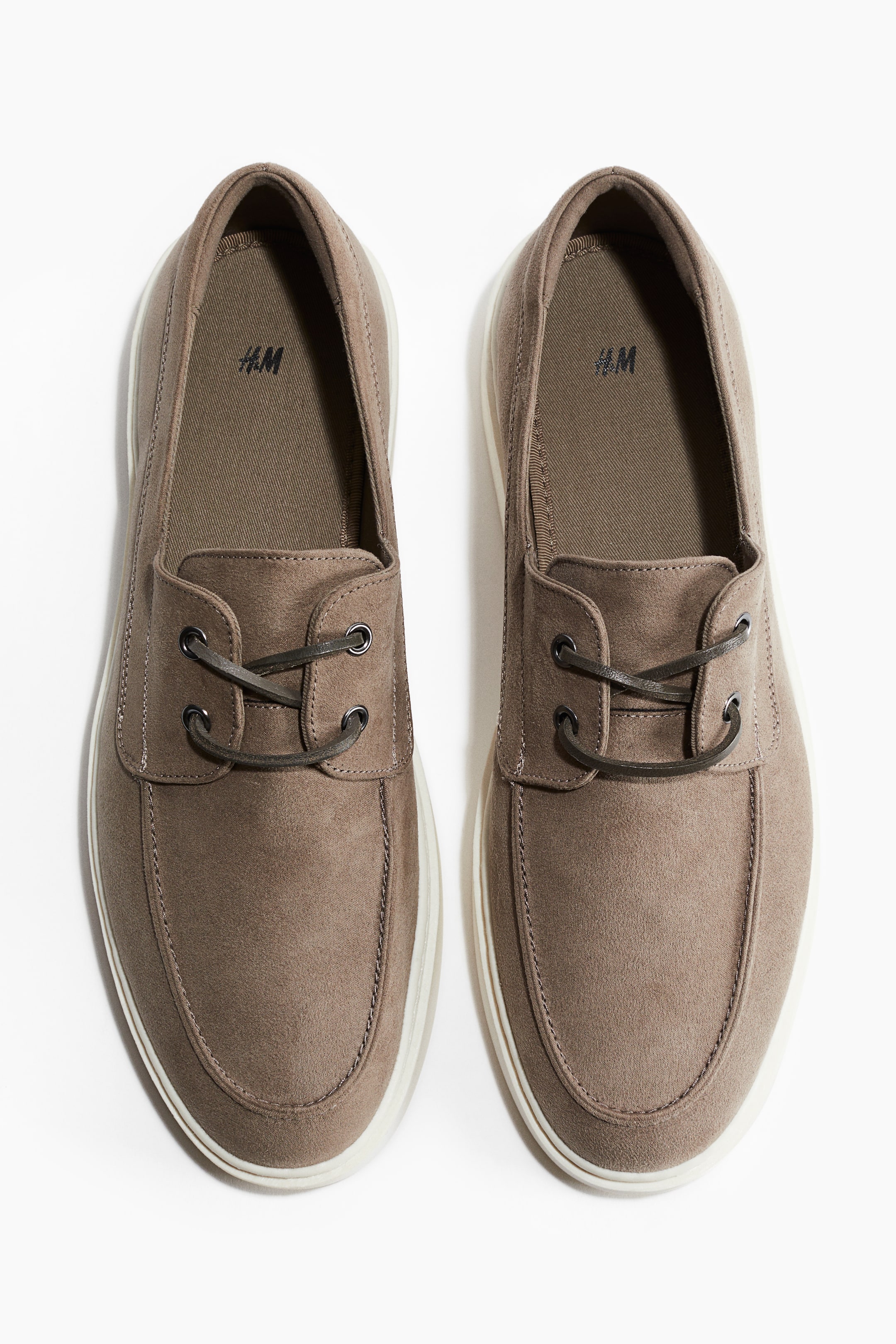 Scarpe da barca con lacci in alto e cucitura tipo mocassino sul davanti. Fodera e soletta in tela di cotone, suola zigrinata per offrire una buona presa.