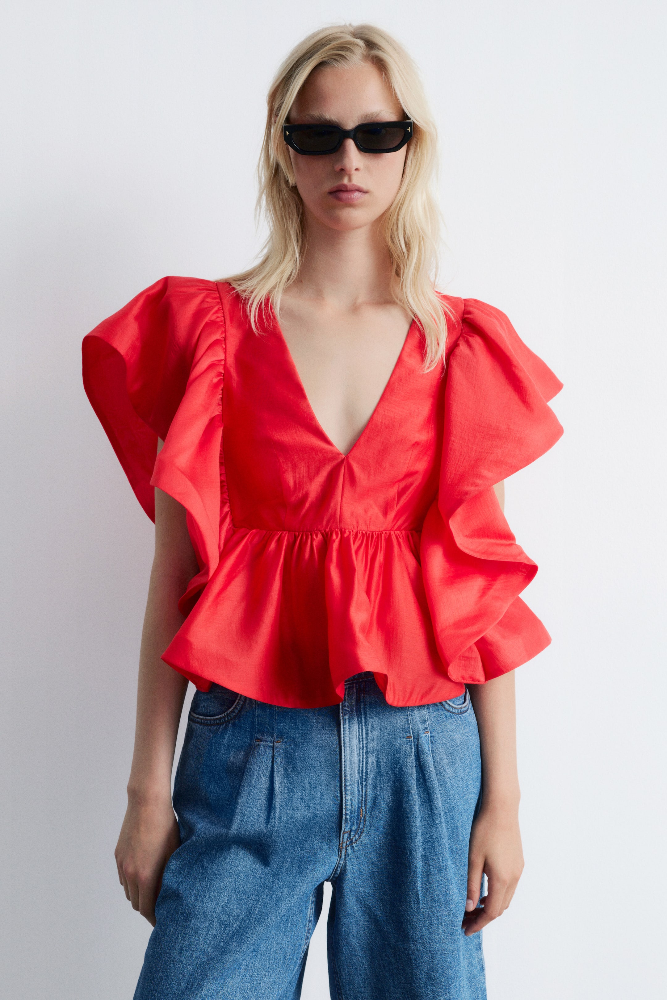 Vera e propria dichiarazione di stile, questa blusa presenta una silhouette a farfalla con maniche voluminose, impreziosite da audaci balze che scendono a cascata lungo l'orlo. Presenta una profonda scollatura a V sul davanti e sul retro, pannelli laterali con lavorazione smock e una delicata chiusura con laccetto sul collo. Può essere abbinata a un paio di jeans o a una gonna semplice. Lunghezza della blusa:55 cm (EU 36/UK 8/US 4)