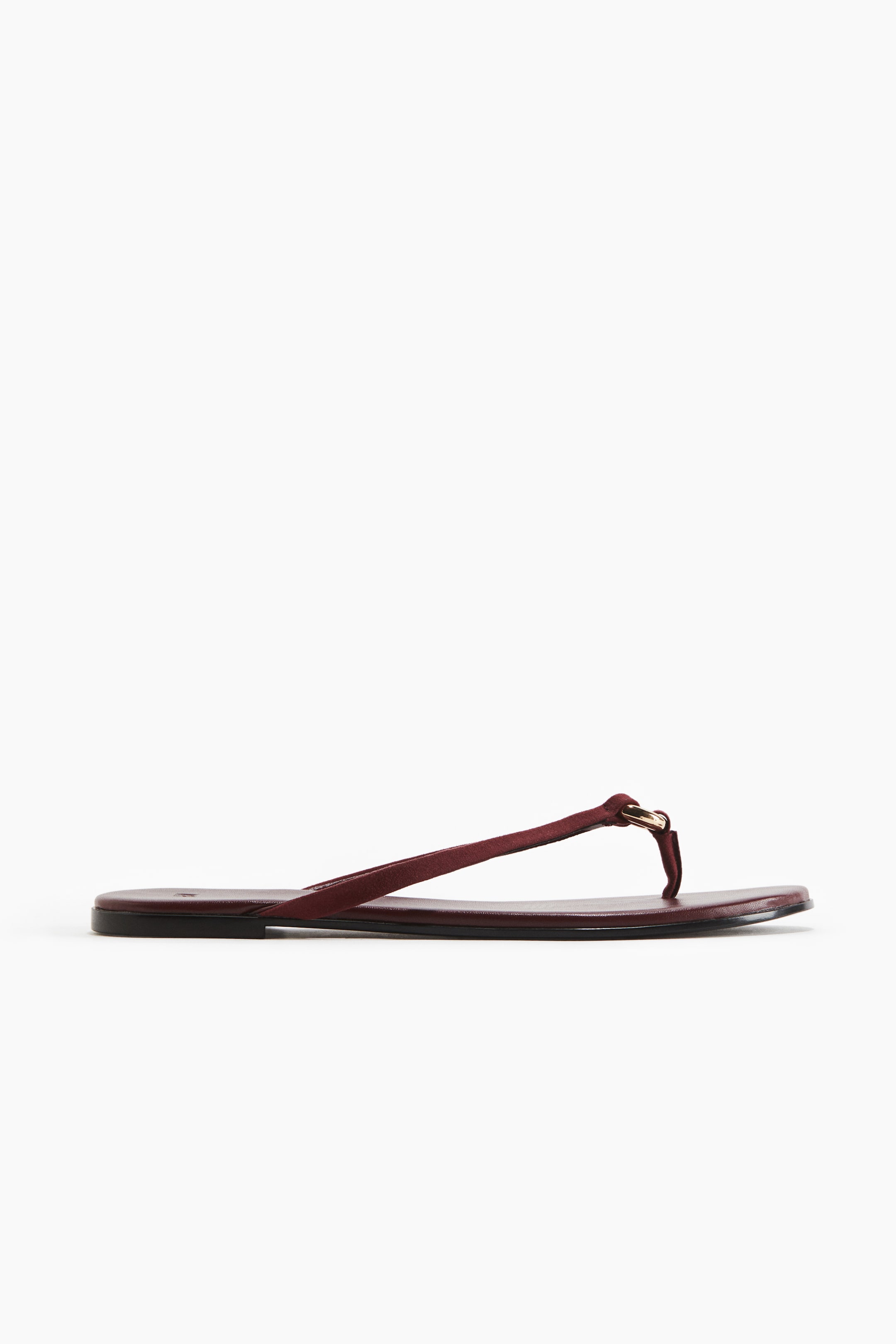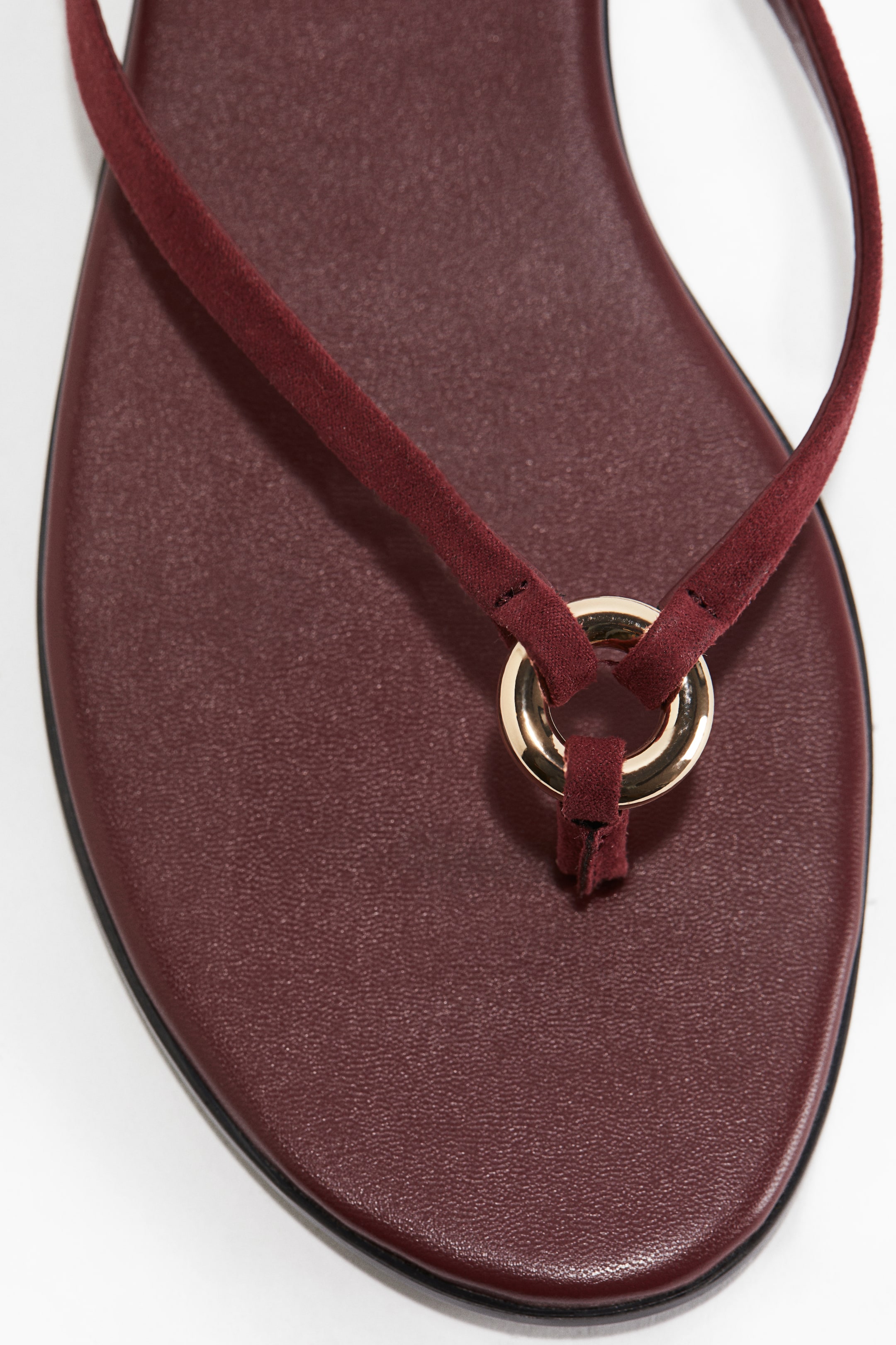 Infradito con punta arrotondata, fascette sottili sul piede fissate ad uno spesso anello di metallo davanti.