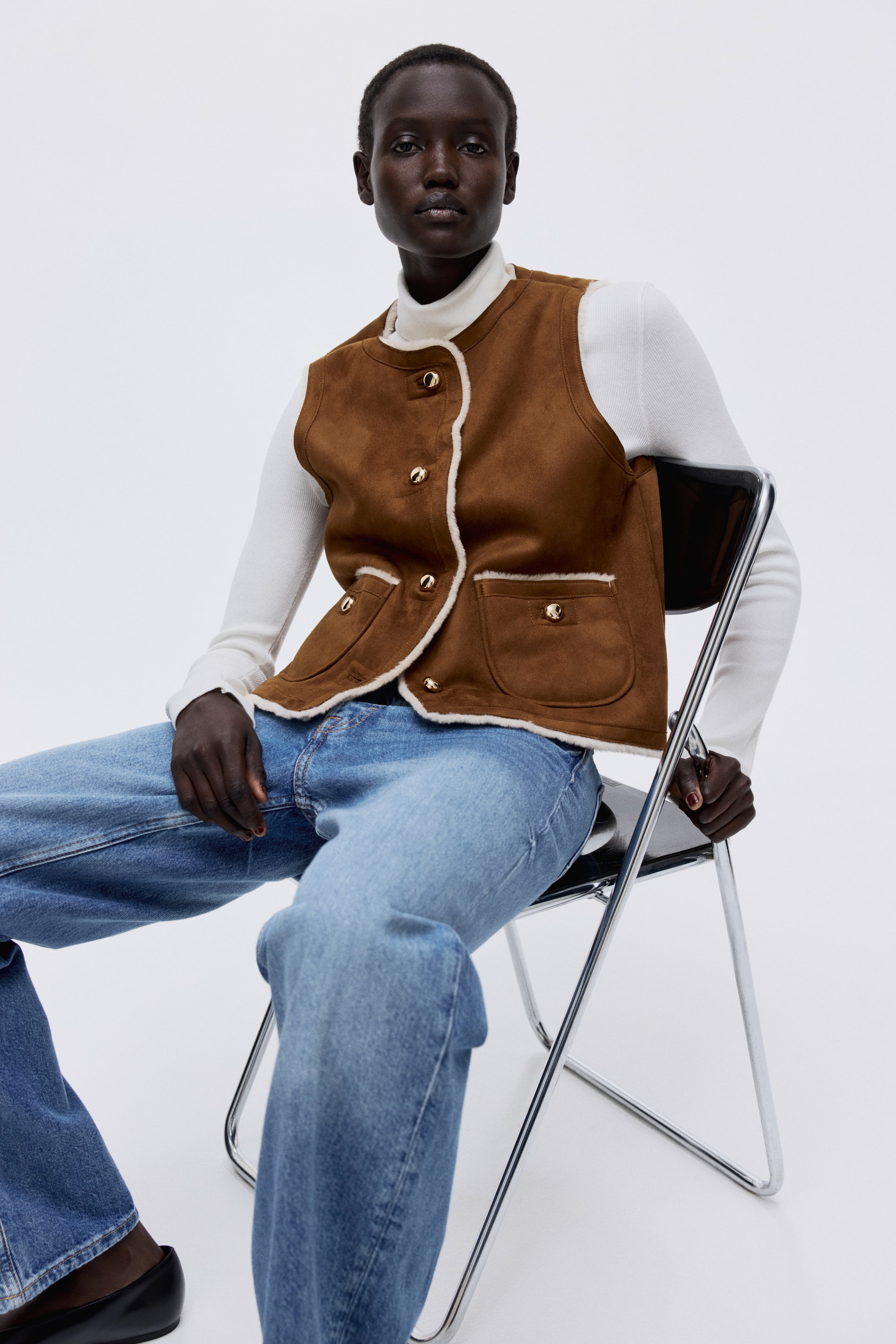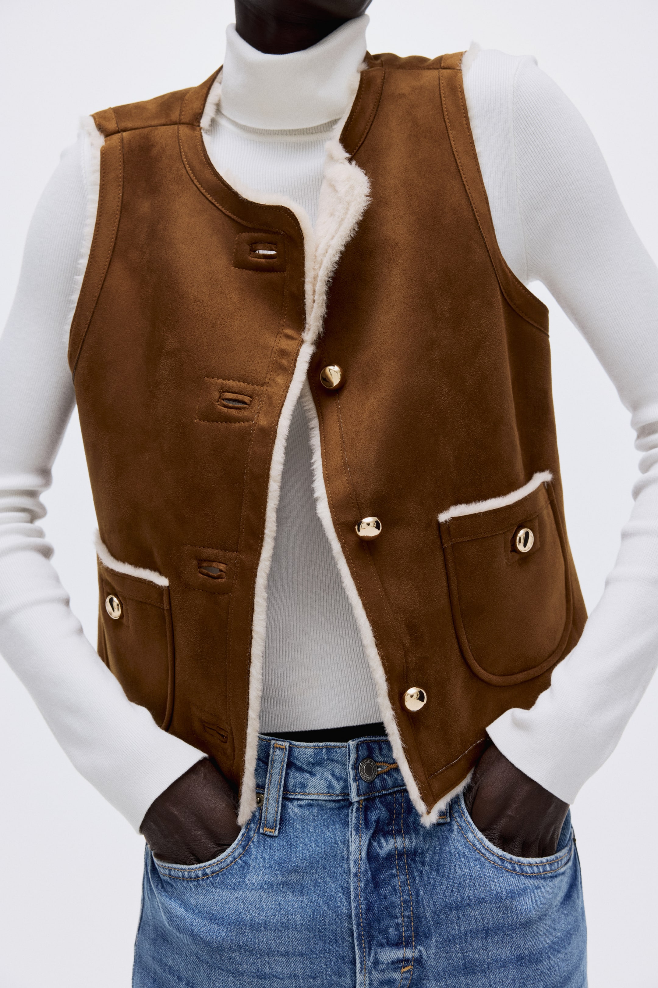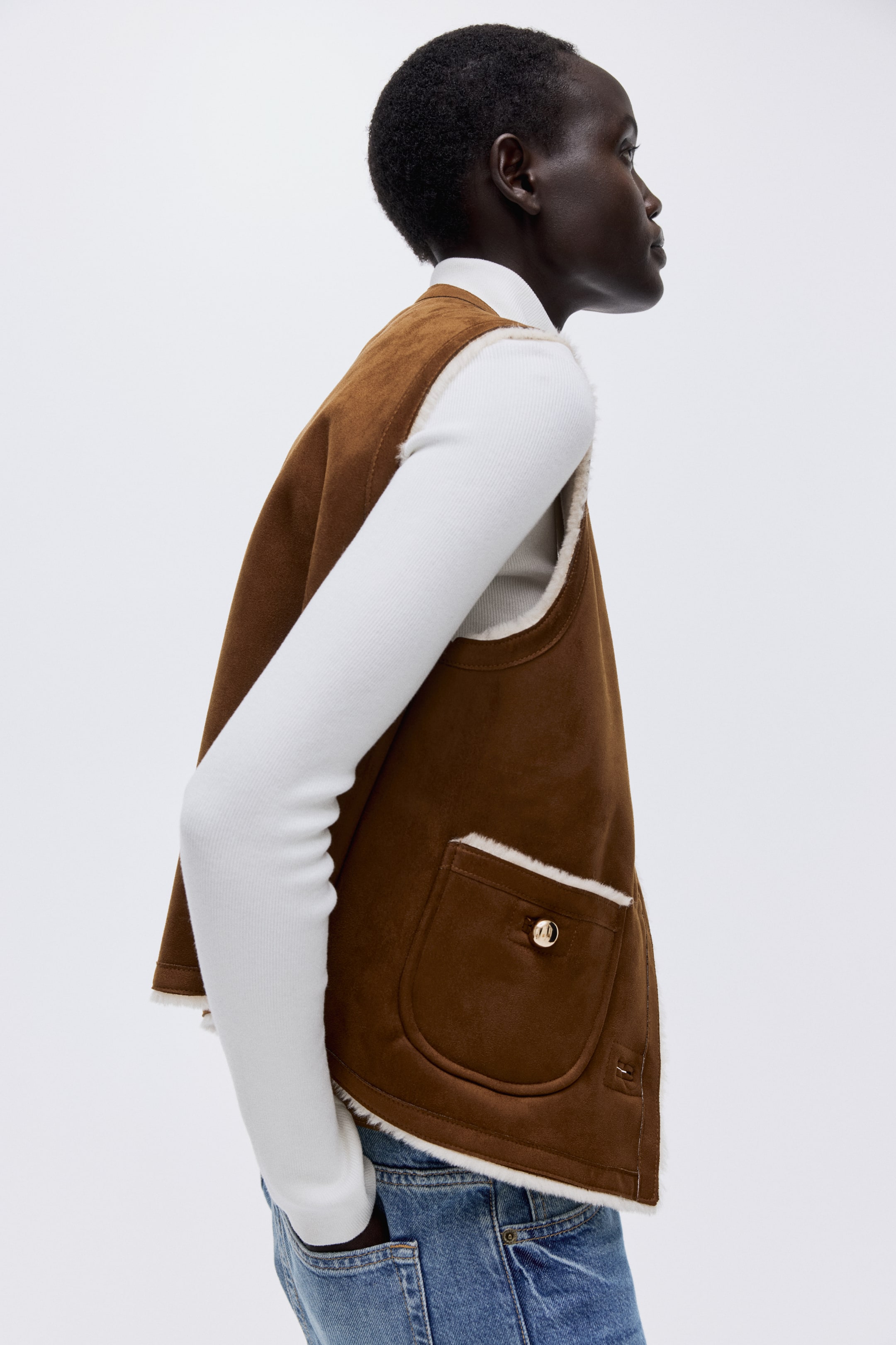 Gilet corto e aderente in tessuto con morbida finitura nappata e morbida fodera in pelliccia di pile. Scollo rotondo, bottoni in metallo davanti. Tasche applicate davanti con bottone.