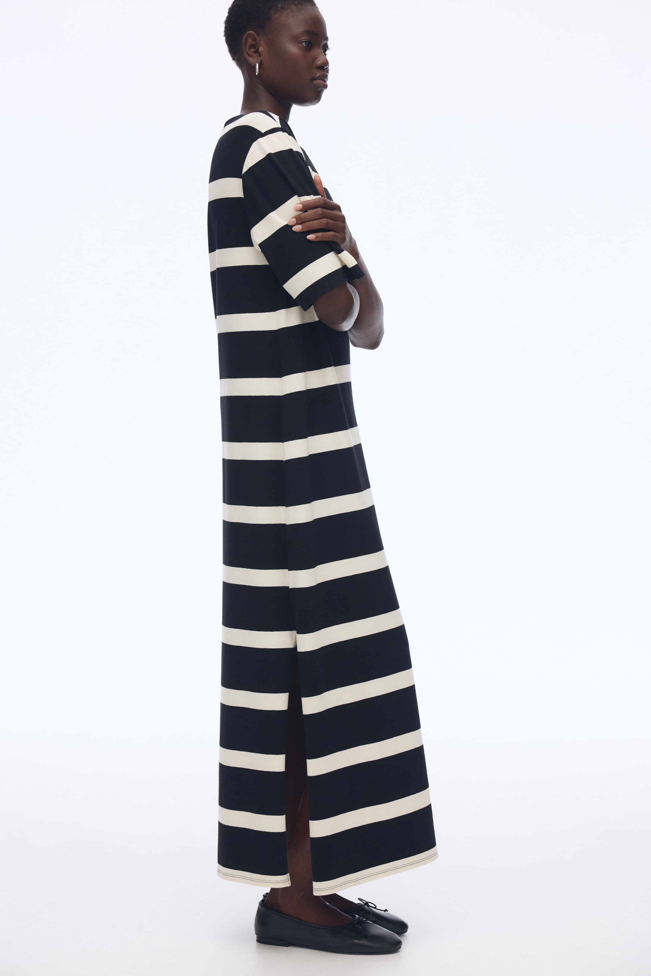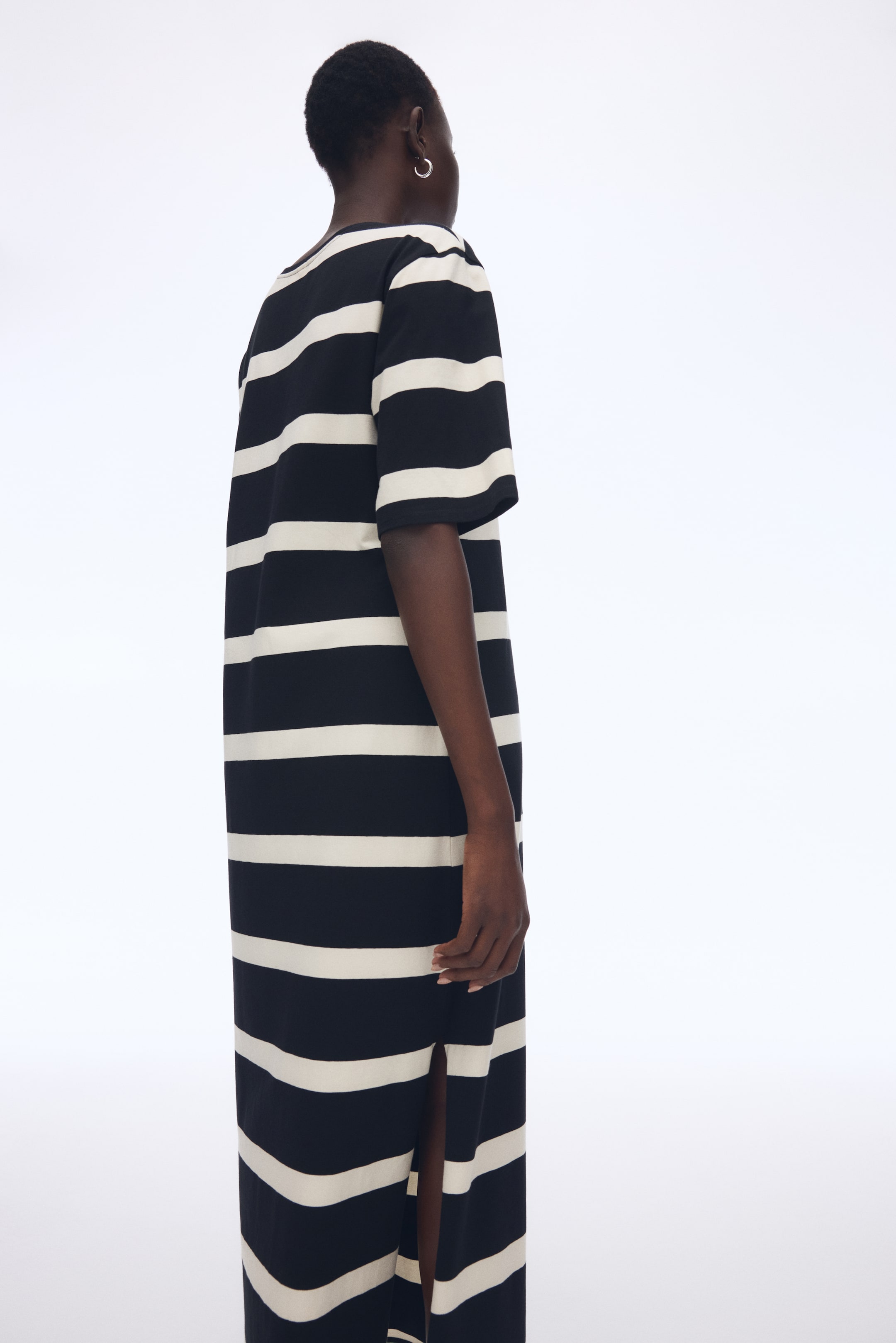 Abito lungo a T-shirt in morbido jersey. Scollo rotondo, spalle ribassate. Bordo dritto in basso, profondo spacco laterale.