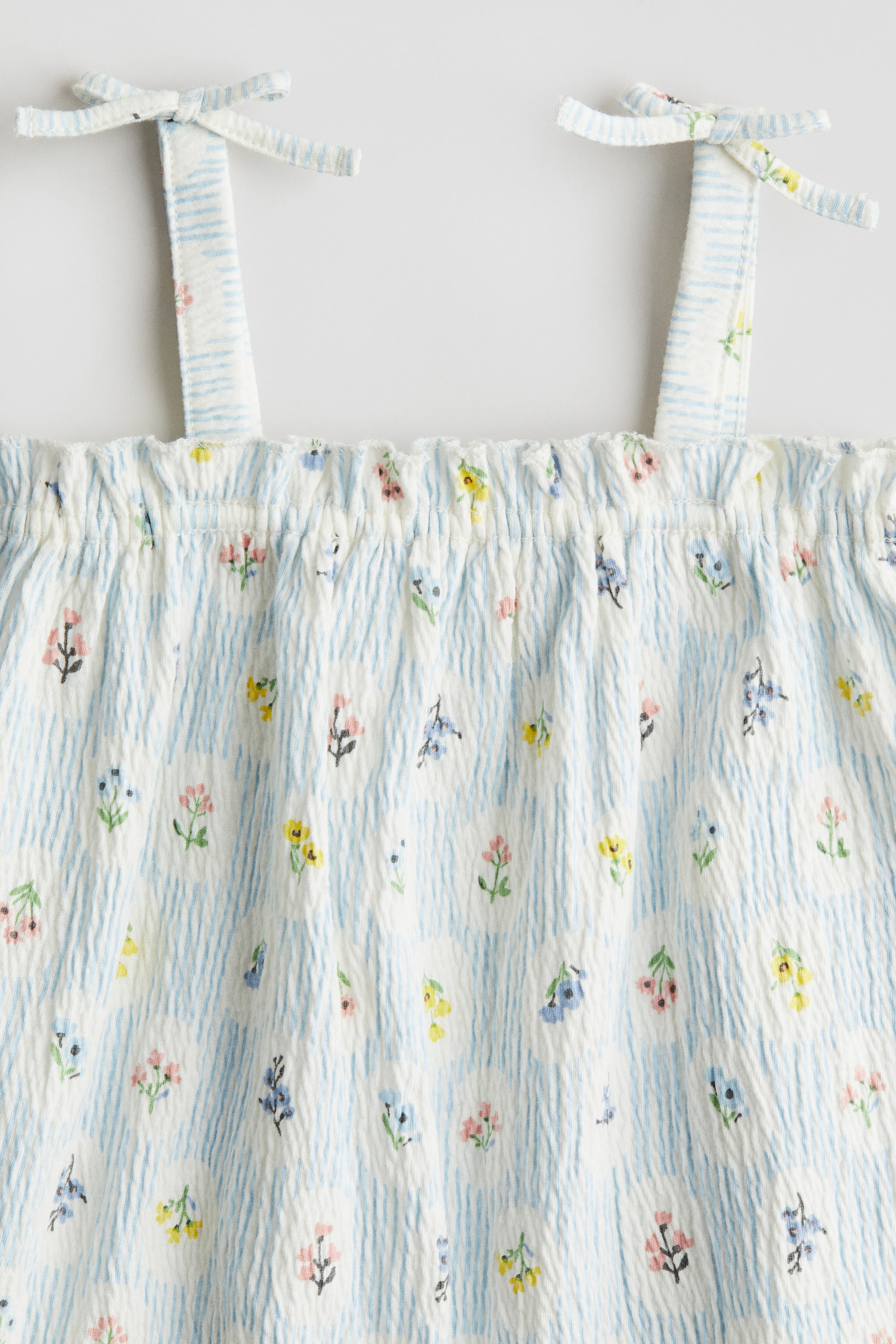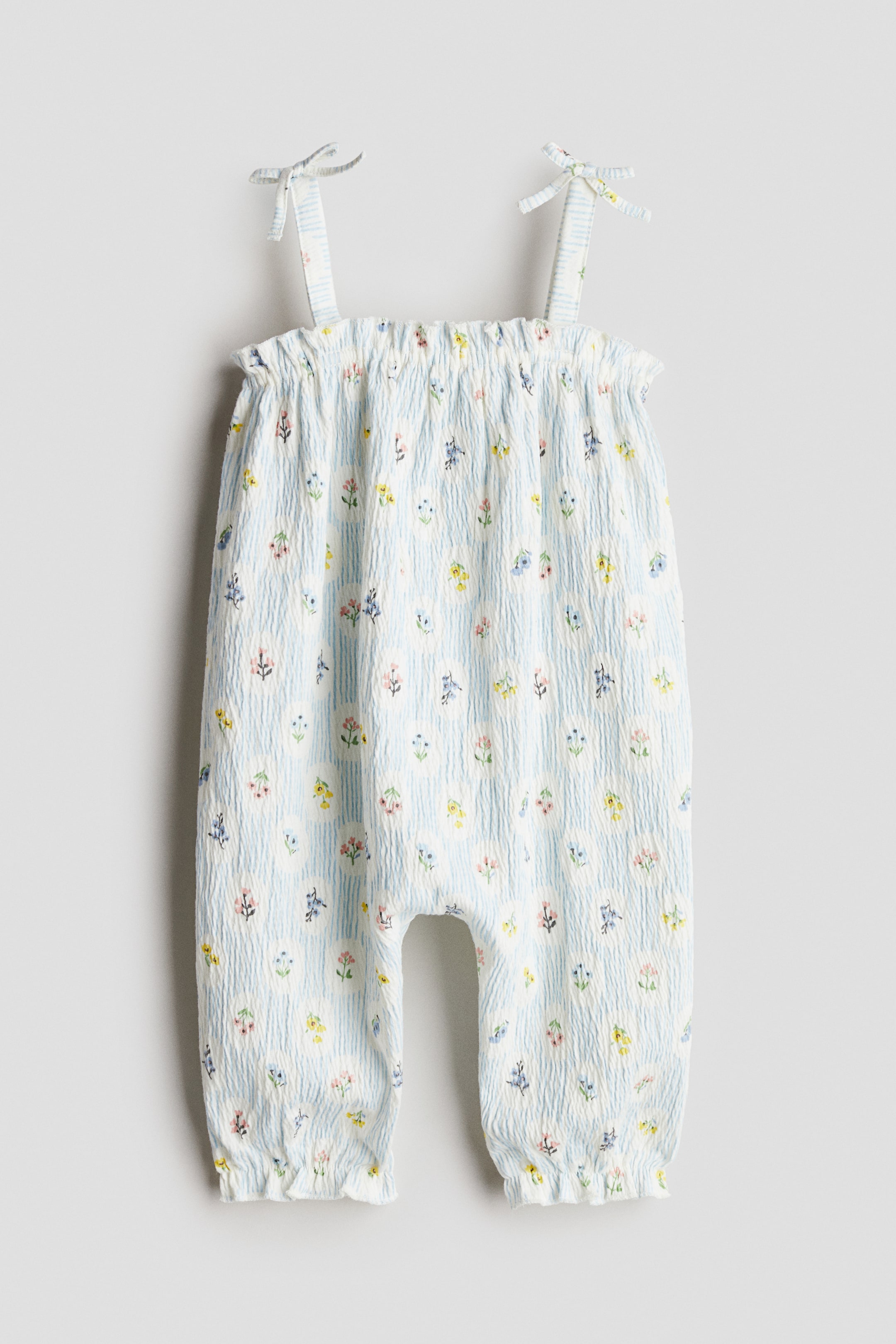 Pagliaccetto in morbido jersey goffrato con motivi stampati. Scollo squadrato, spalline sottili con laccetti decorativi in alto. Elastico sottile e bordo a volant in alto e a fondo gamba.