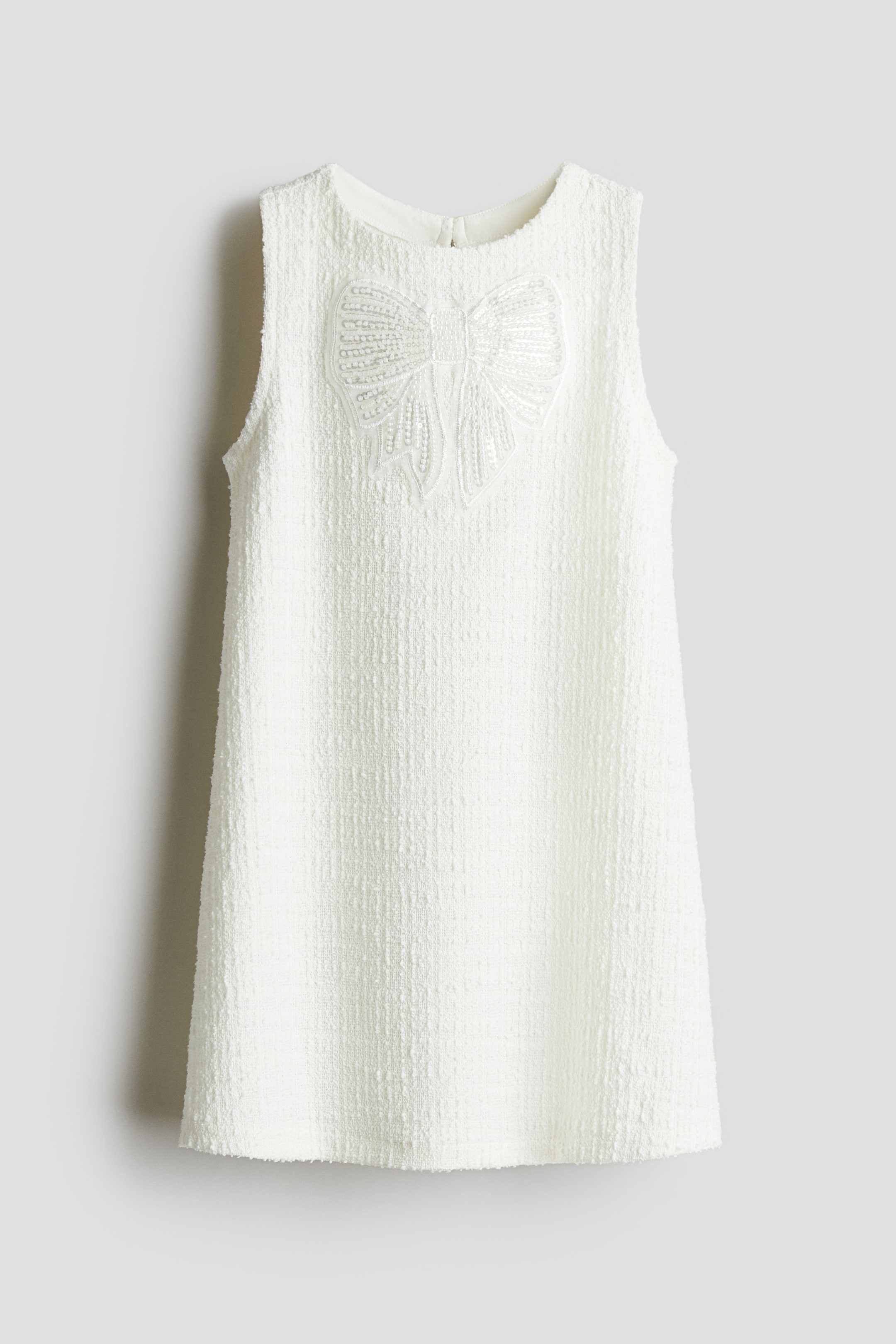Abito senza maniche in morbido tessuto bouclé con applicazioni in alto. Apertura a goccia con bottone sulla nuca.