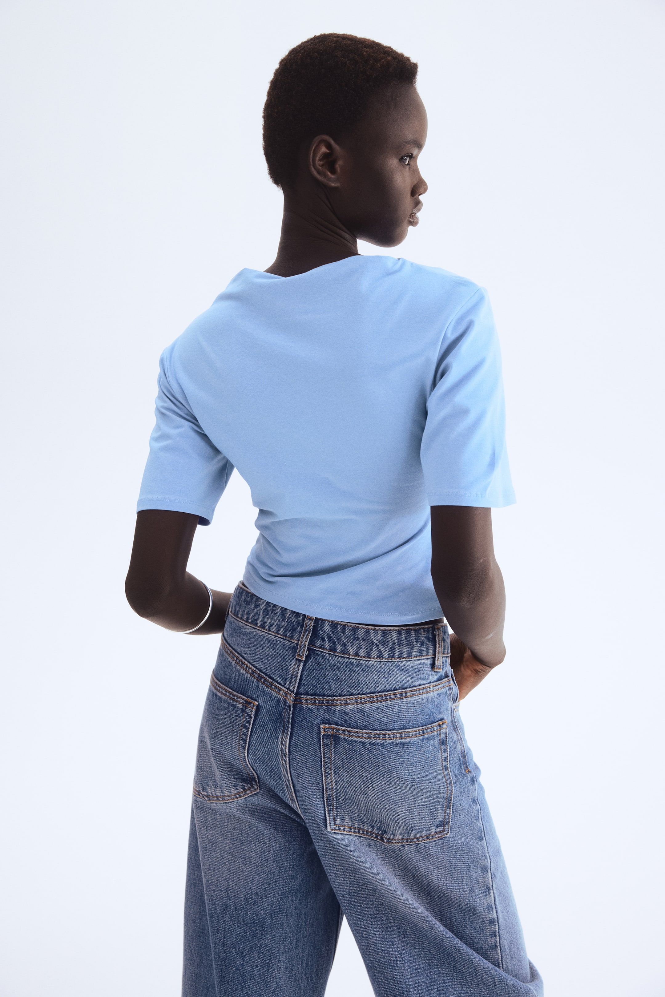 T-shirt aderente in morbido jersey di cotone. Scollo asimmetrico e cuciture arricciate su una spalla e su un lato in vita per un effetto drappeggiato.