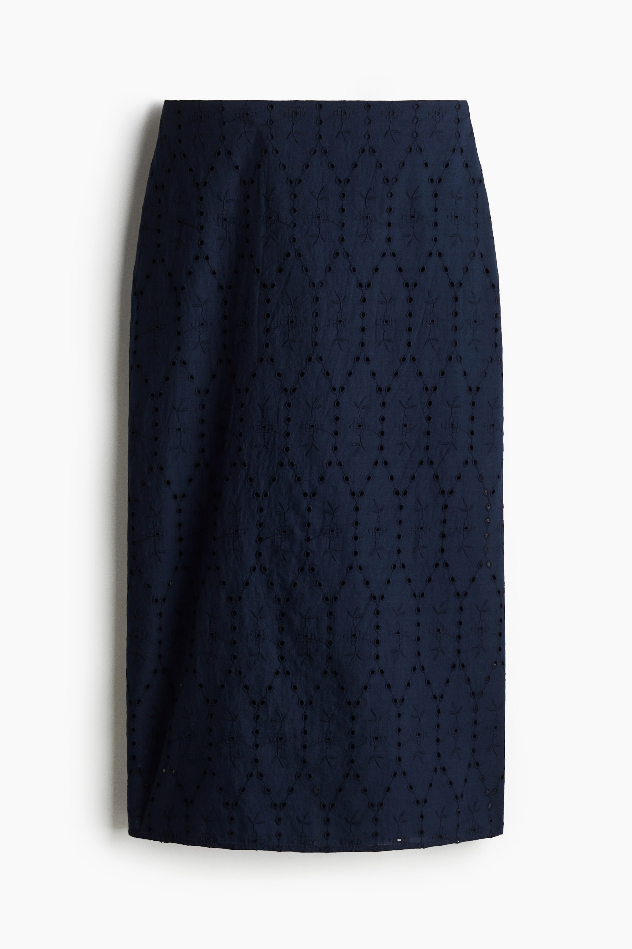 Gonna in tessuto di cotone con sangallo, lunghezza al polpaccio. Chiusura con gancetto e cerniera nascosti dietro, bordo dritto in basso con spacco dietro. Sottogonna corta.