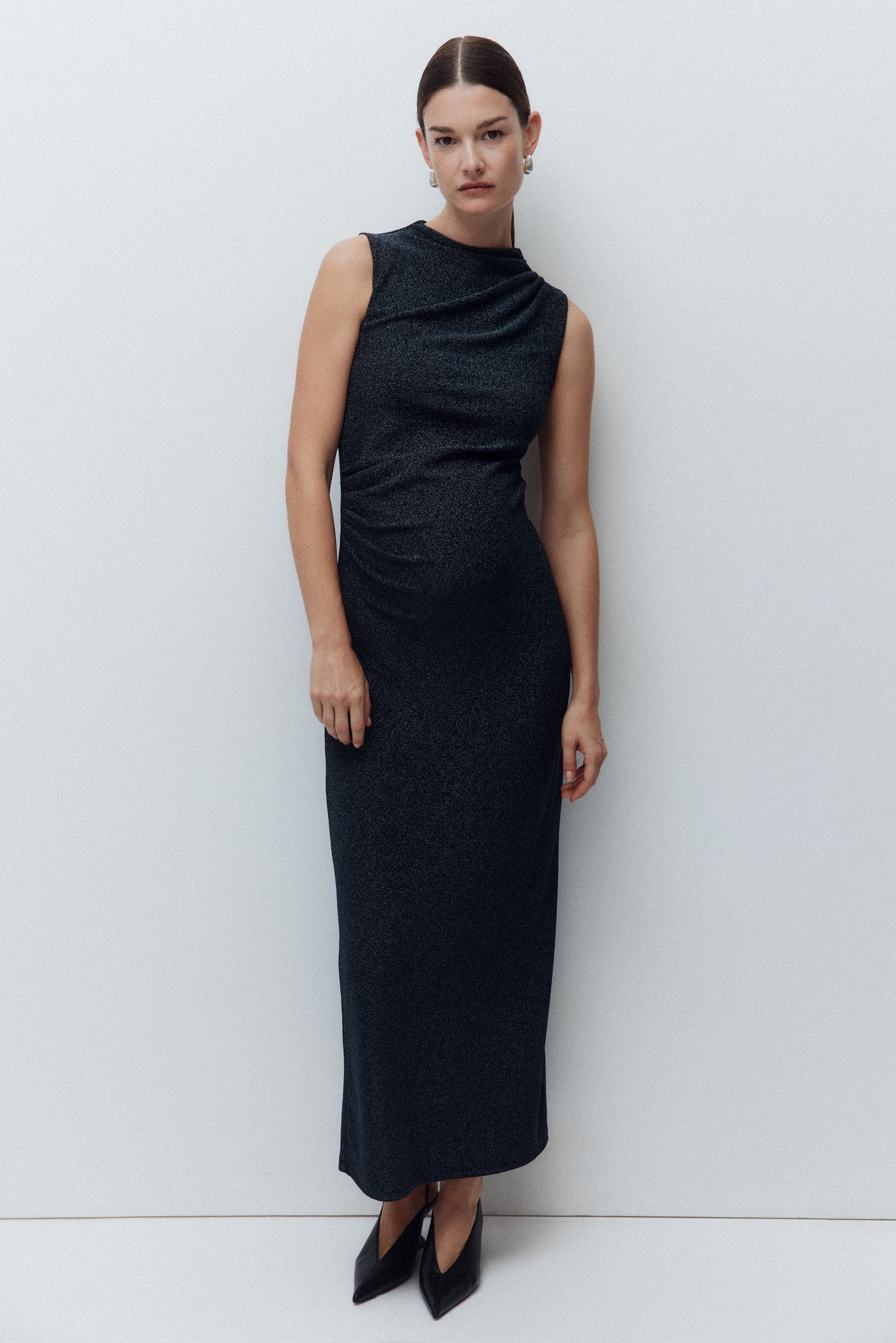 Abito lungo e aderente in morbido jersey. Modello a collo alto e senza maniche. Pieghe su una spalla e in vita sul lato opposto, per creare un effetto drappeggiato.
