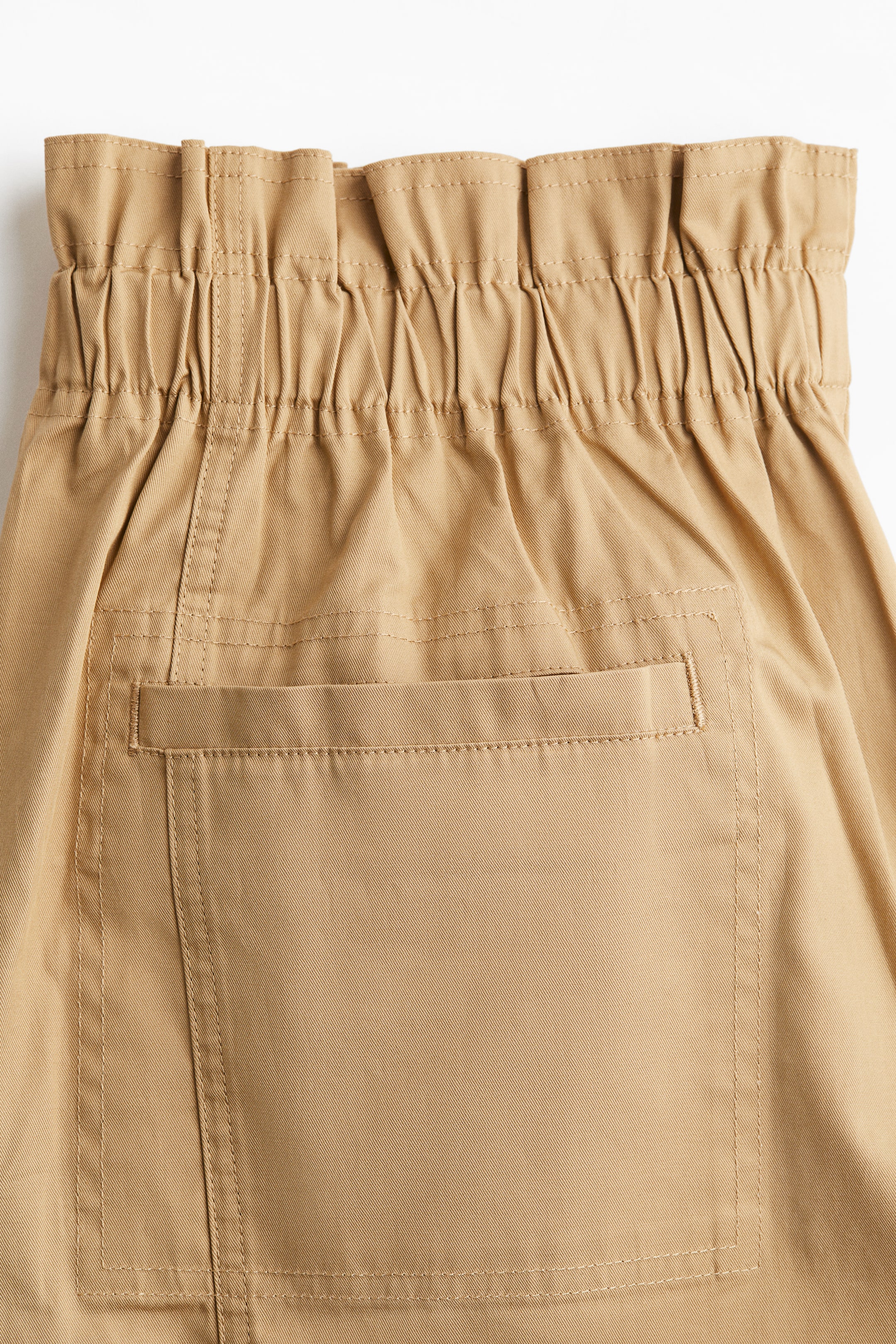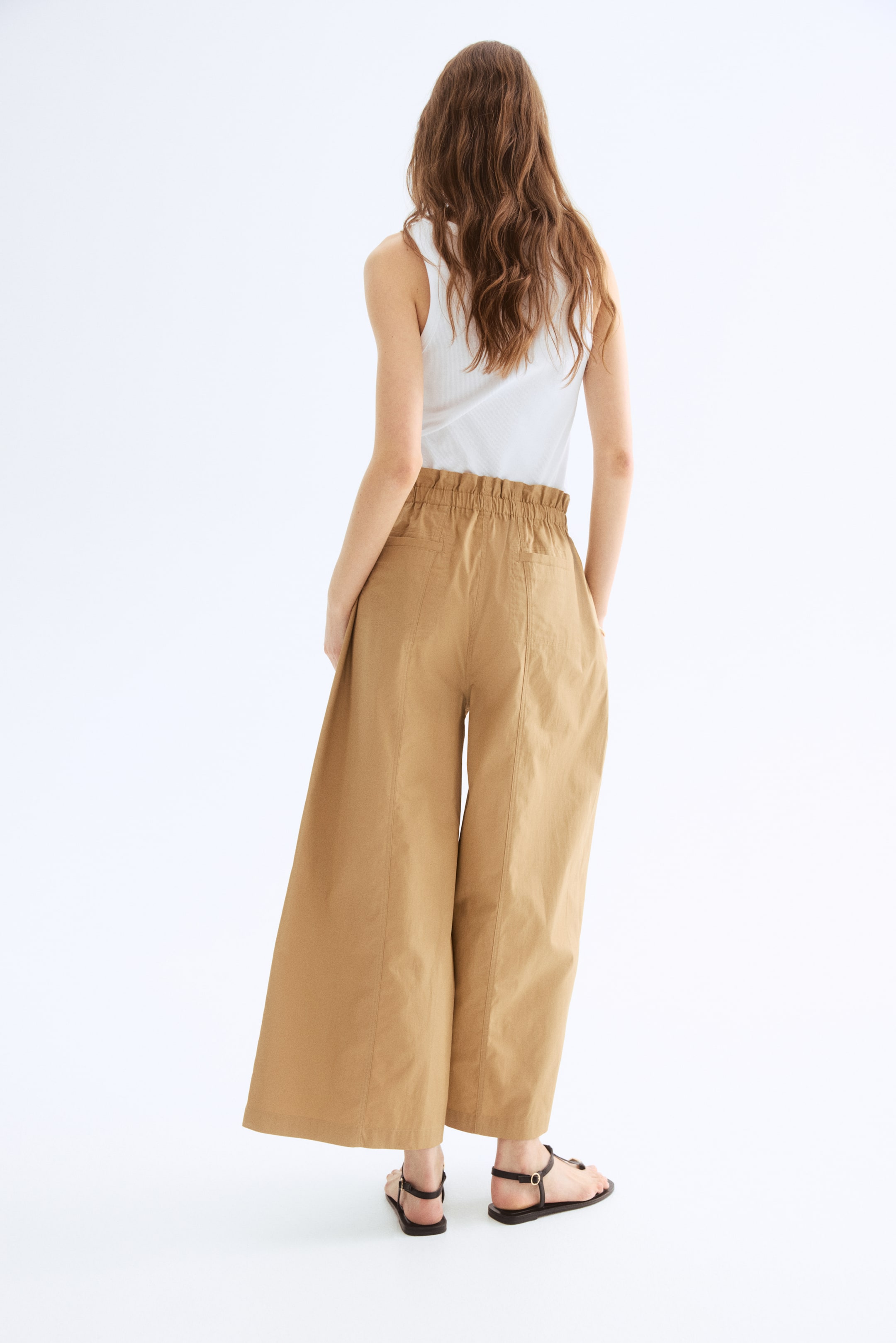 Pantaloni ampi in twill di cotone, lunghezza alla caviglia. Vita alta a sacchetto con elastico rivestito e bordo a volant. Patta con bottoni a vista, tasche laterali oblique e tasche posteriori a filetto. Gamba dritta con cuciture davanti e dietro.