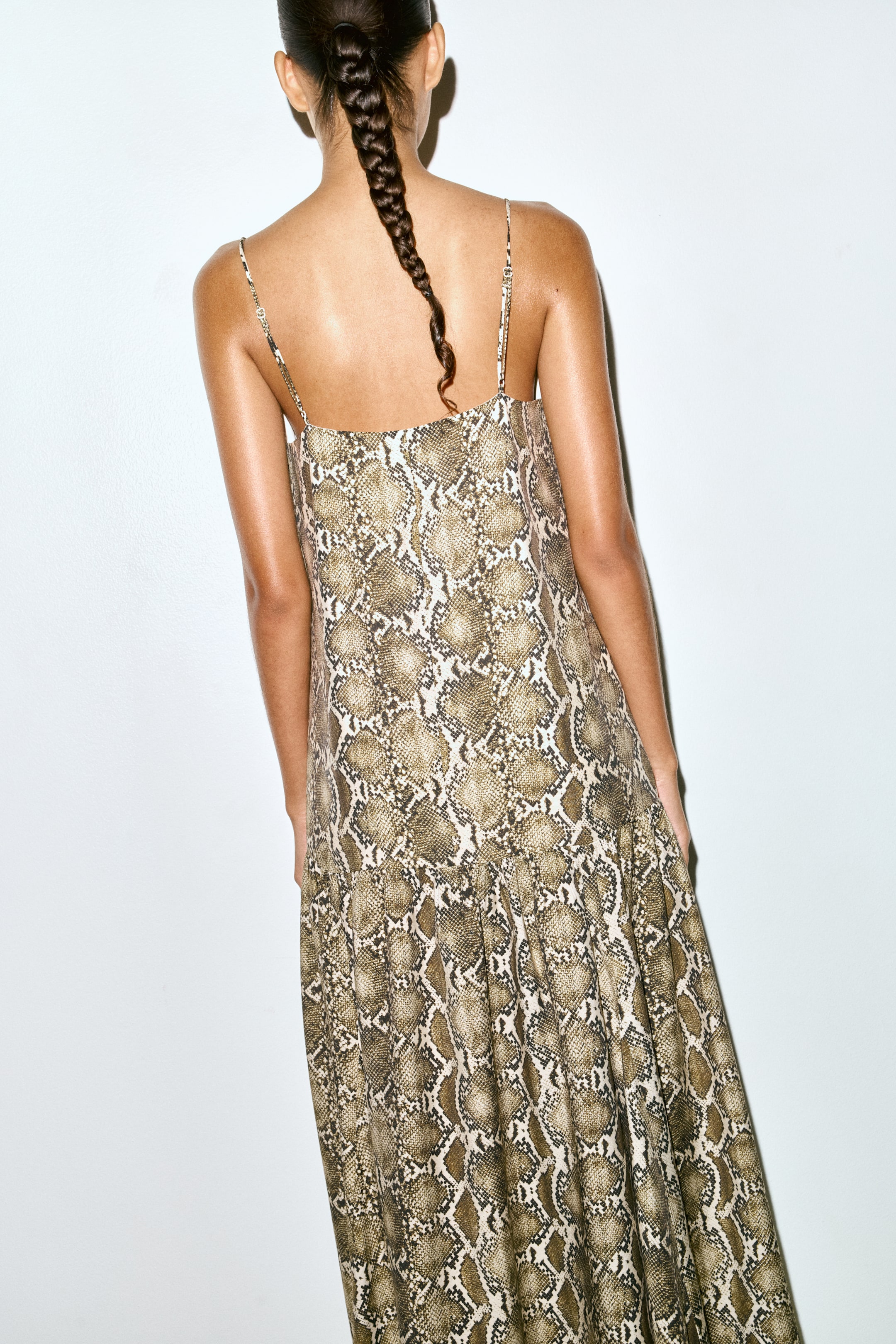 Abito lungo alla caviglia in tessuto. Scollatura profonda e spalline sottilissime e regolabili. Cucitura arricciata sotto i fianchi, gonna svasata con pieghe godet per dare maggior volume. Parzialmente foderato.