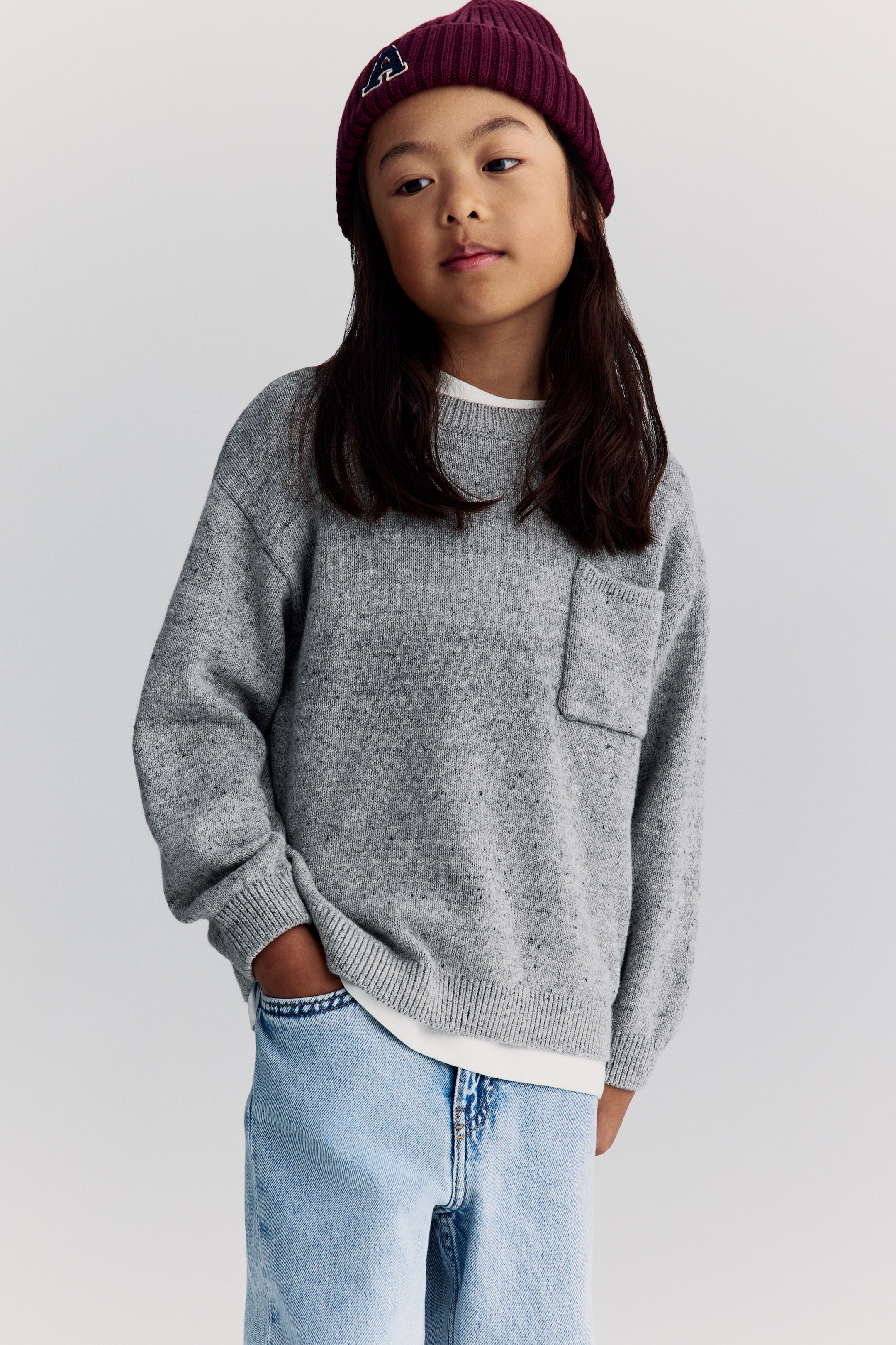 Pullover in morbida maglia sottile di cotone. Taschino applicato sul petto. Scollo rotondo, spalle basse e maniche lunghe. Bordo a costine sullo scollo, a fondo manica e in basso.