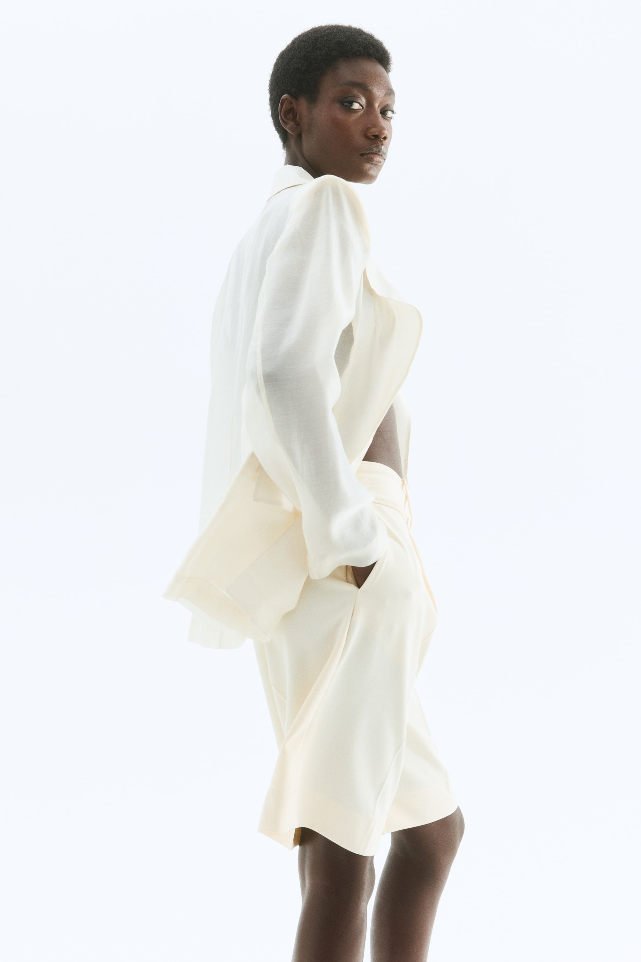 Shorts in jersey con vita alta. Patta con cerniera, girovita allungato con chiusura a gancetto. Tasche laterali seminascoste, pinces davanti e pieghe davanti e dietro.