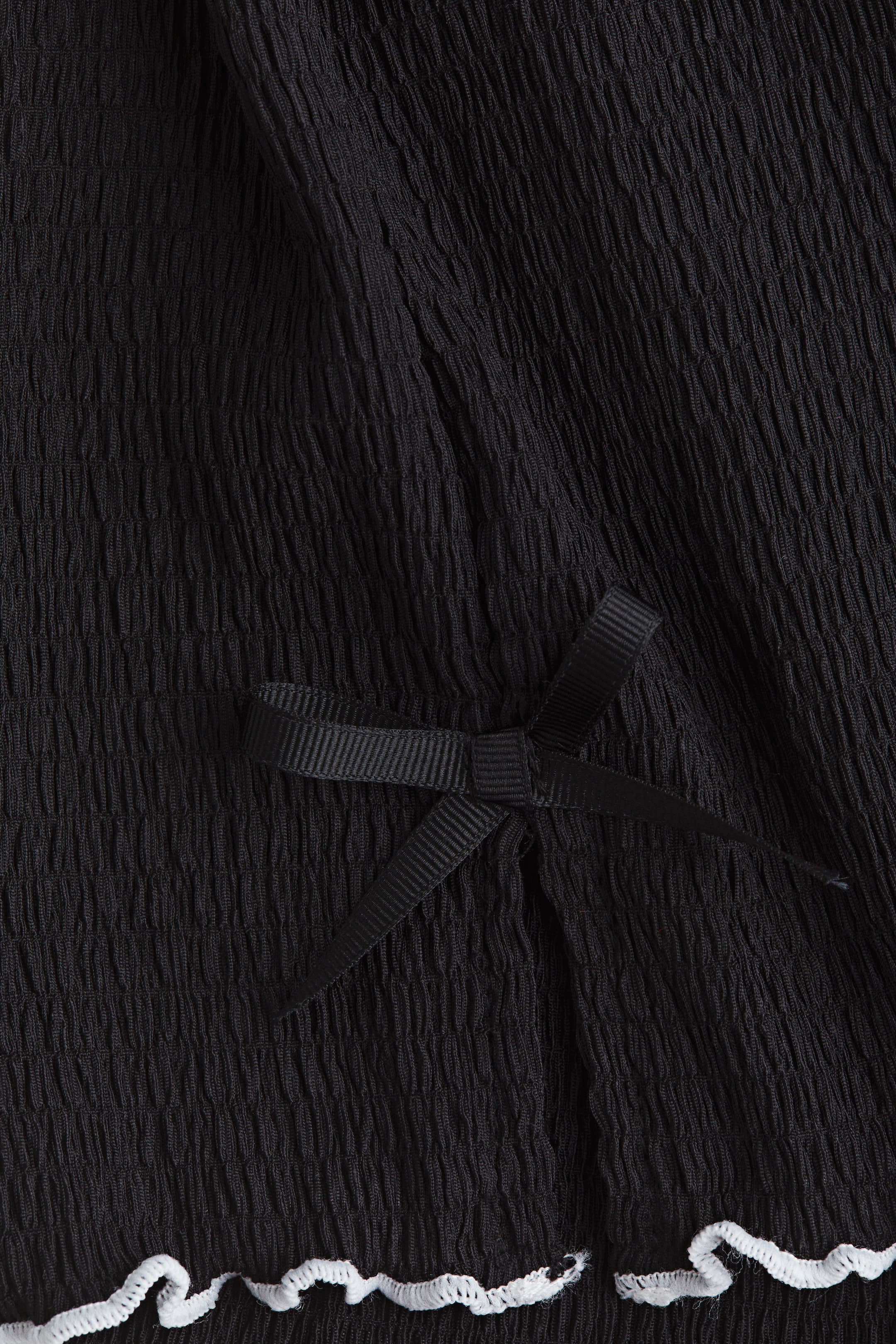 Top a maniche corte in jersey goffrato con bordi di colore a contrasto. Scollo rotondo, spacchetto con fiocco decorativo ai due lati in basso.
