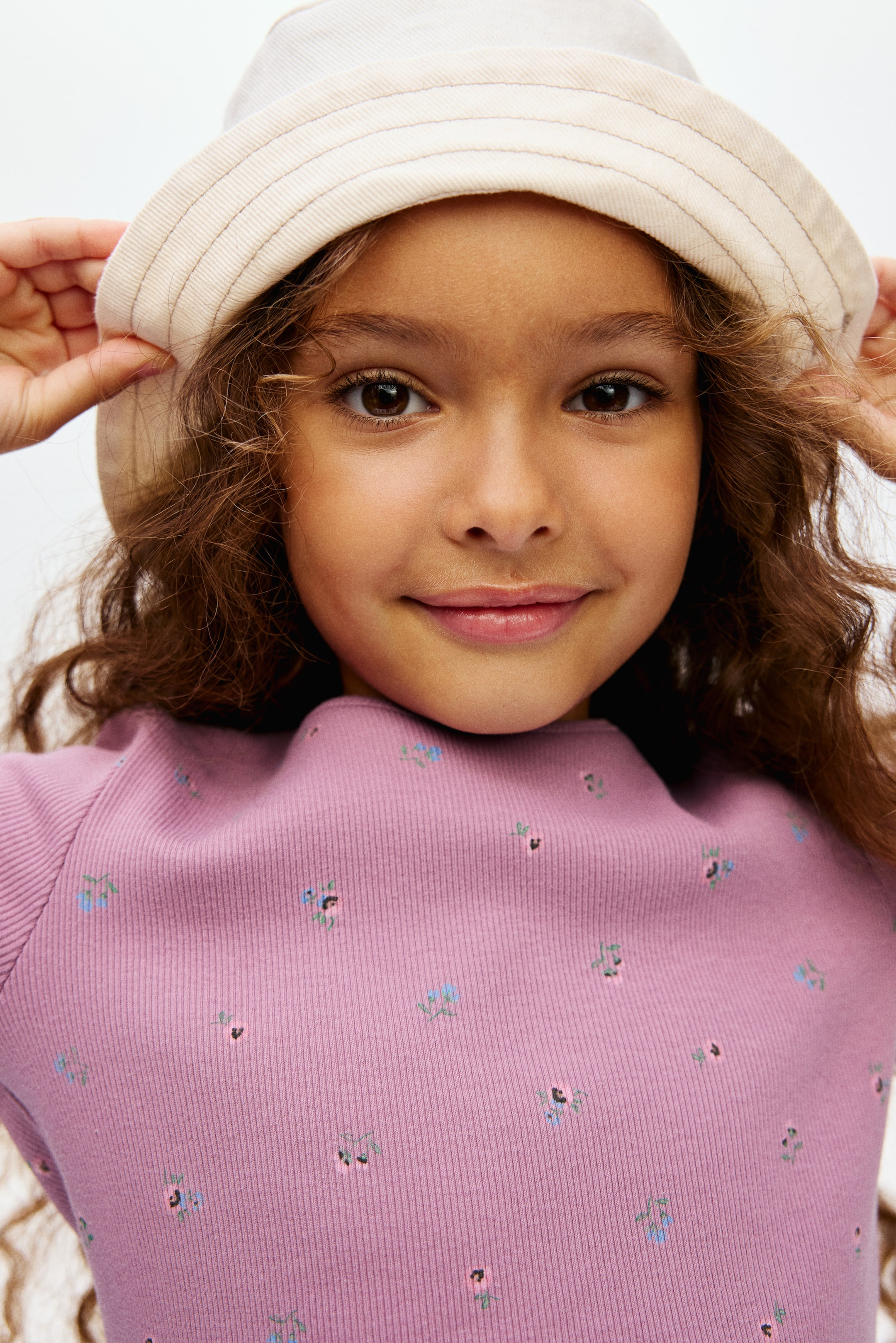 Top in morbido jersey di cotone a coste con motivi stampati. Scollo rotondo e maniche corte con polsini con bordi a overlock.