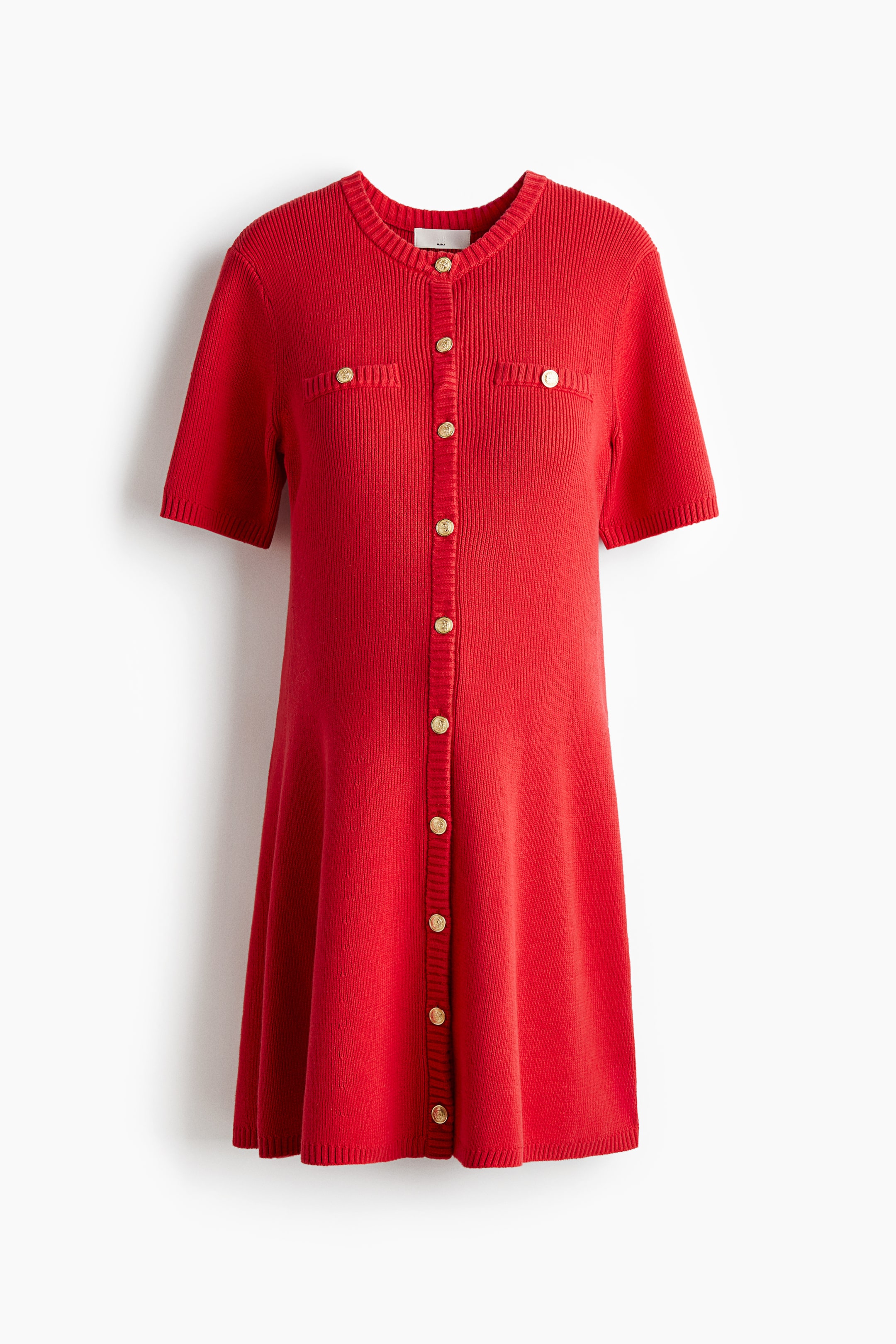 Abito corto in misto cotone a coste. Scollo rotondo e bottoni davanti. Finti taschini sul petto, maniche corte e gonna leggermente svasata.