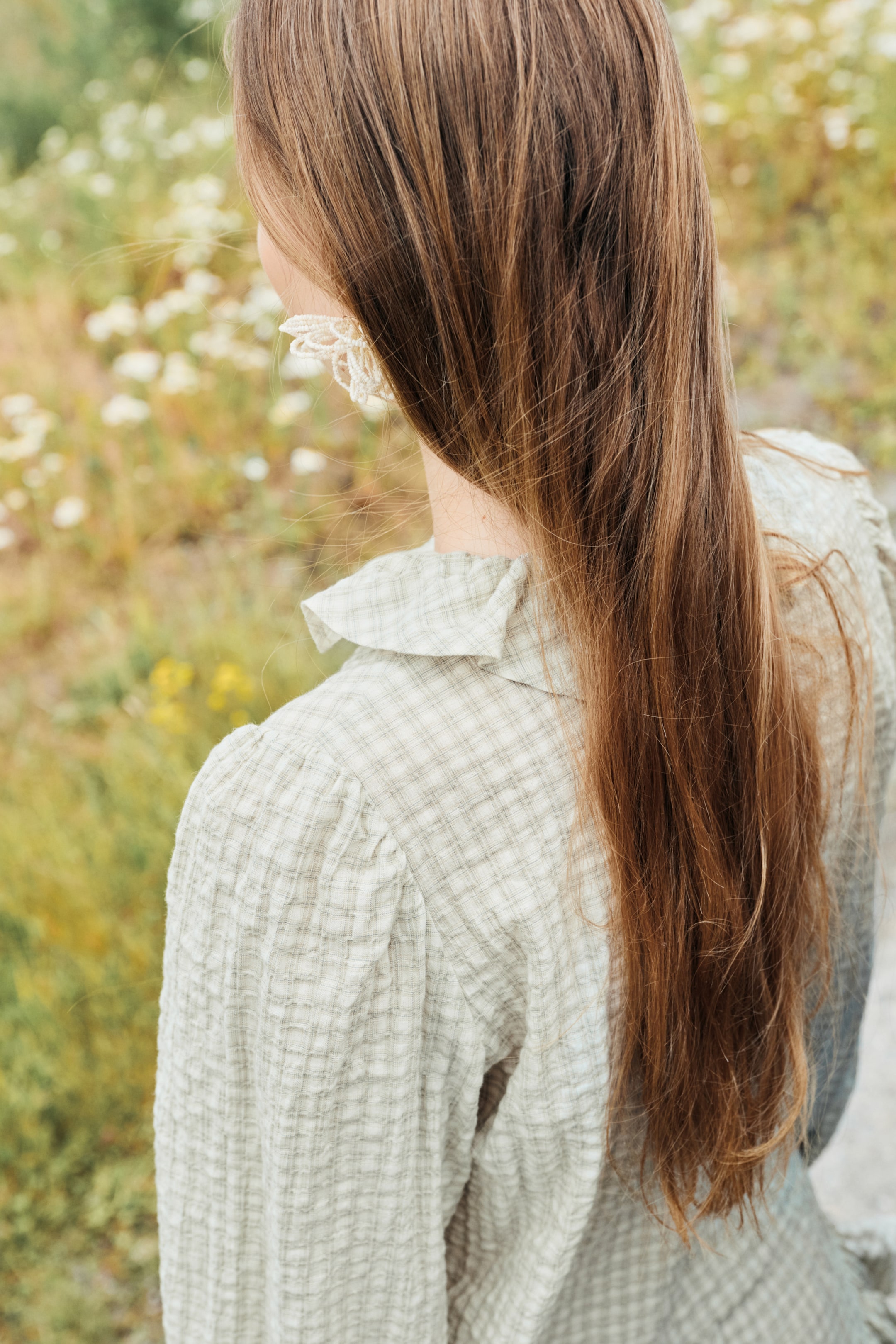 Camicetta in tessuto di cotone. Colletto a volant con laccetti sottili da annodare sul davanti. Bottoni rivestiti sul davanti, maniche lunghe a palloncino con bottoni rivestiti e bordino a volant in fondo.