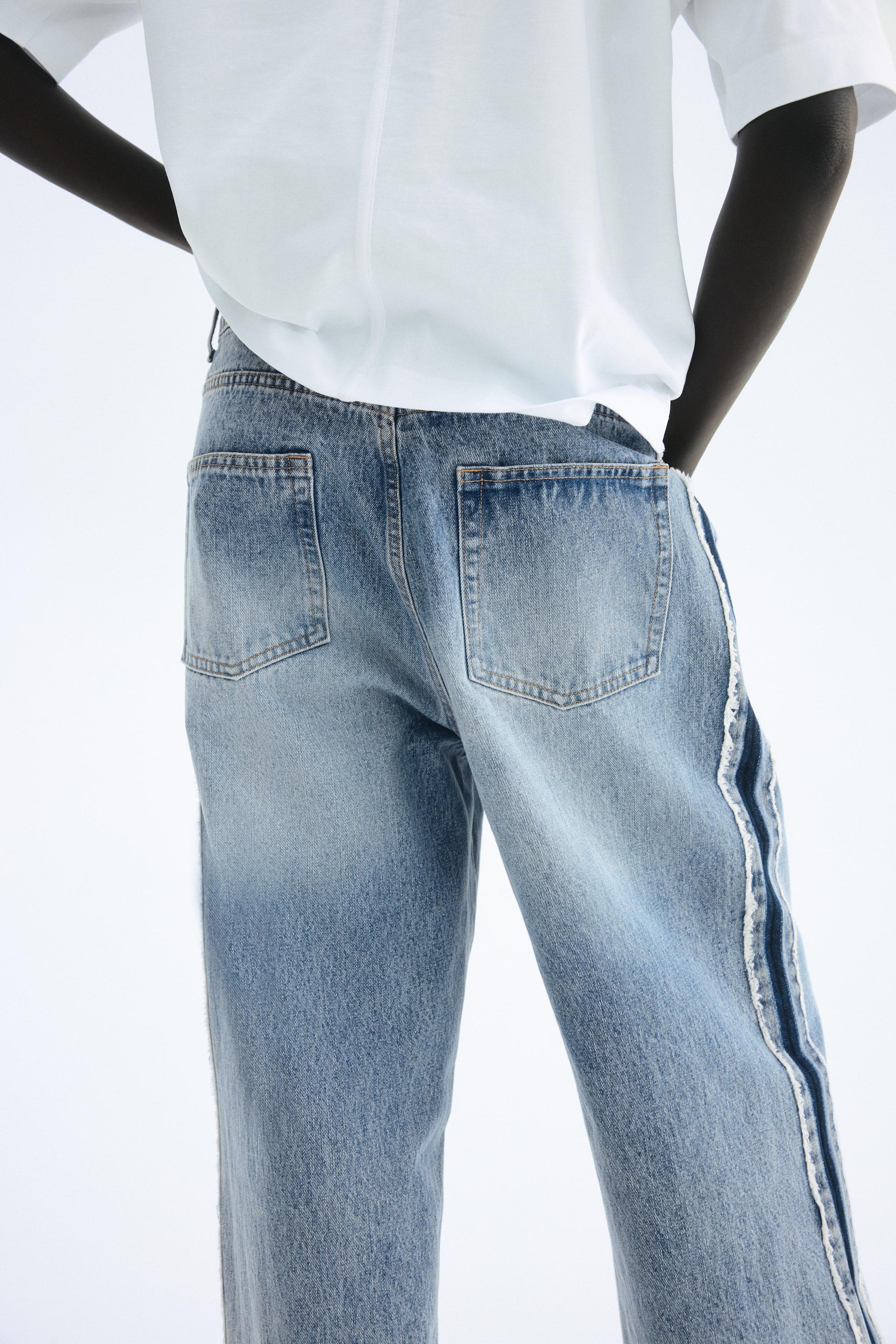 Jeans a 5 tasche in consistente denim di cotone. Vita alta, patta con cerniera e bottone. Pannelli decorativi a contrasto e bordi sfrangiati ai lati.