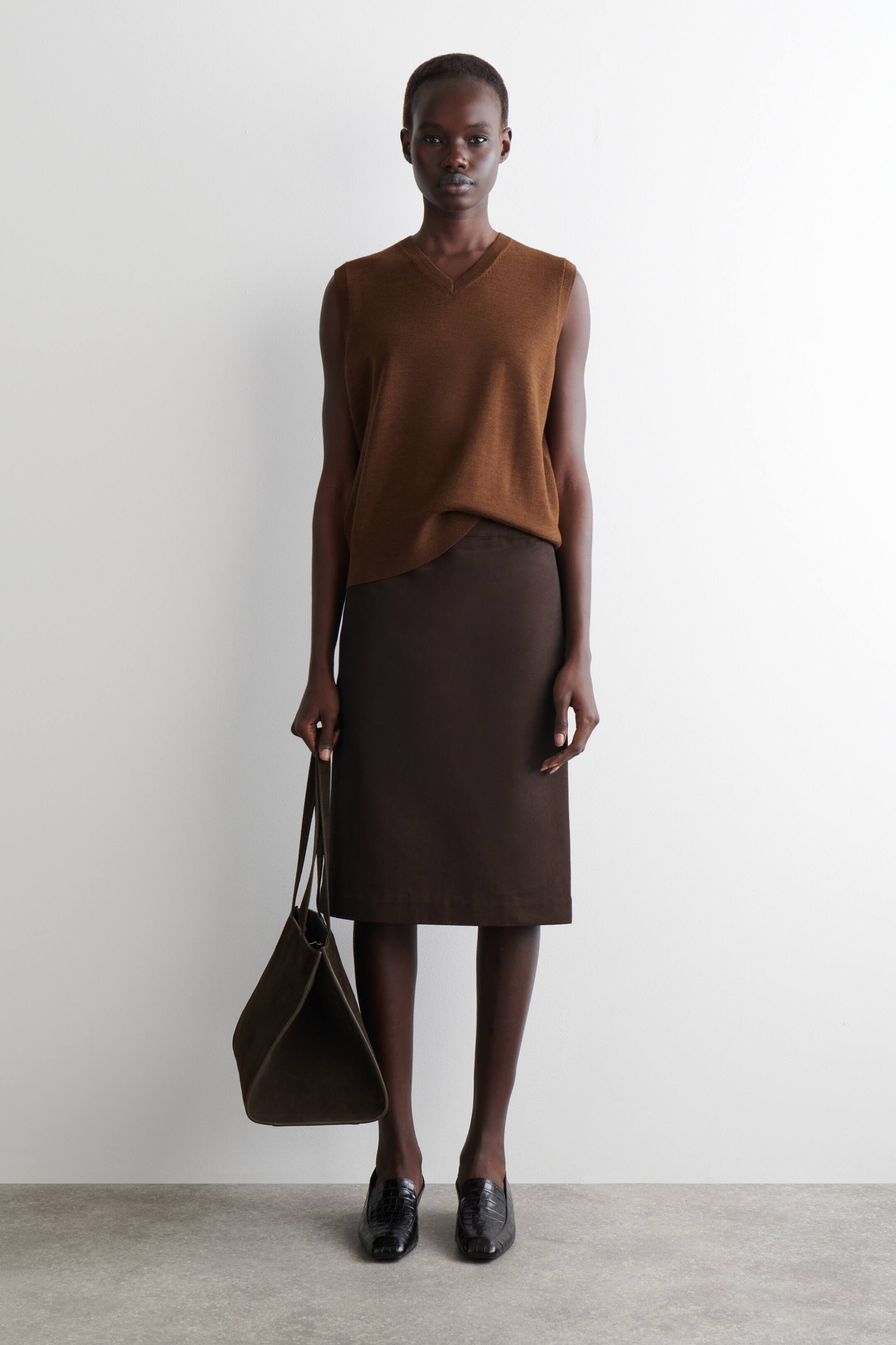 Perfetto per il layering, questo moderno gilet è realizzato in morbidissima lana merino e proposto in un'intramontabile tonalità marrone che si presta a infinite possibilità di abbinamento. Lo scollo a V e l'orlo sono lavorati a coste per valorizzare la texture del capo. Vestibilità rilassata Questo articolo veste grande; si consiglia di scegliere una taglia più piccola Questo prodotto contiene fibre di lana certificate Responsible Wool Standard (RWS) TE-00047206 provenienti da allevamenti certificati secondo i requisiti di benessere degli animali e di gestione del territorio Esterno: 100% lana merino. Escluse le finiture / Lavaggio in lavatrice La lunghezza sul retro nella taglia S è di 57 cm / La modella indossa la taglia S