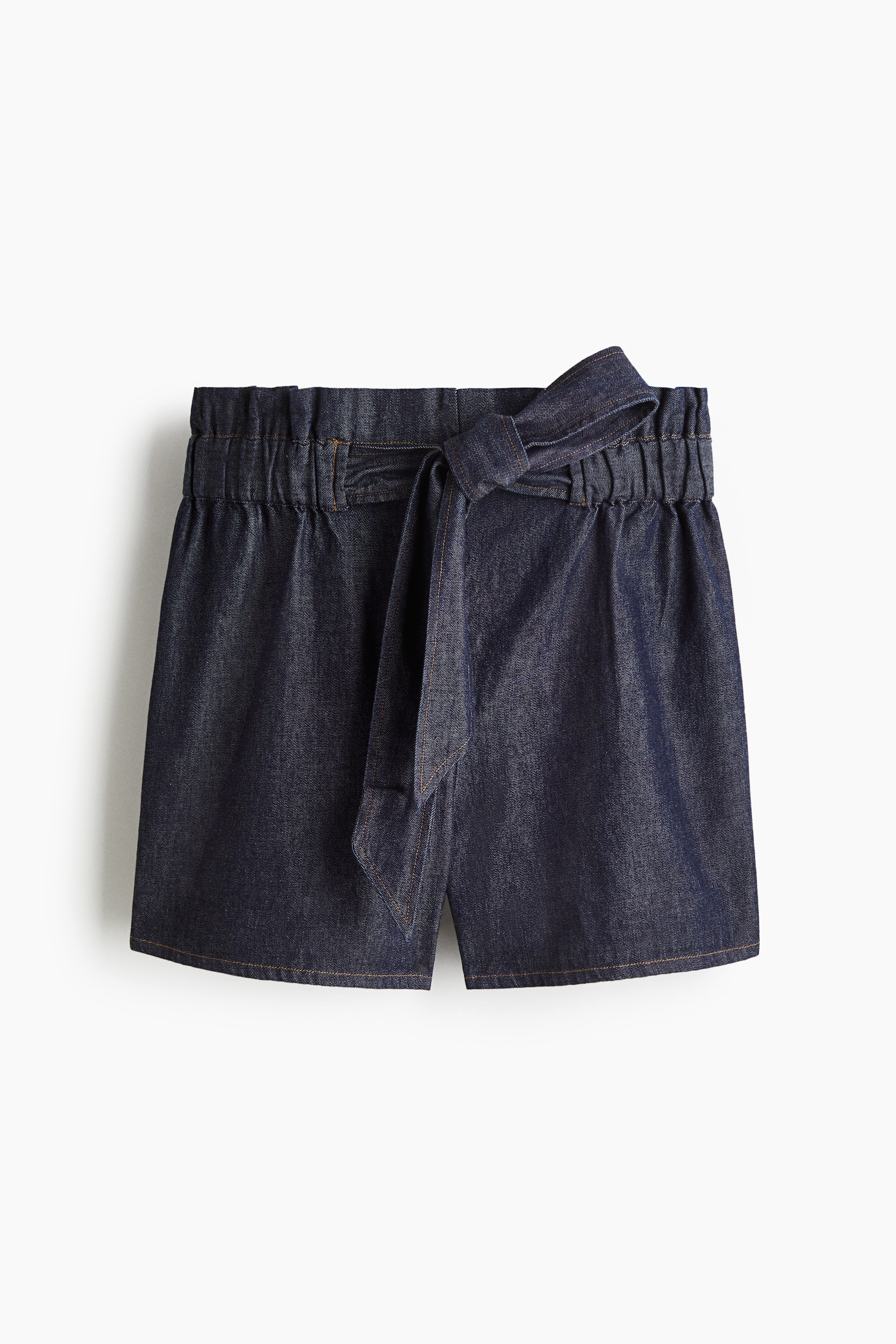 Shorts in denim di cotone. Vita alta a sacchetto con elastico e alta cintura da annodare.