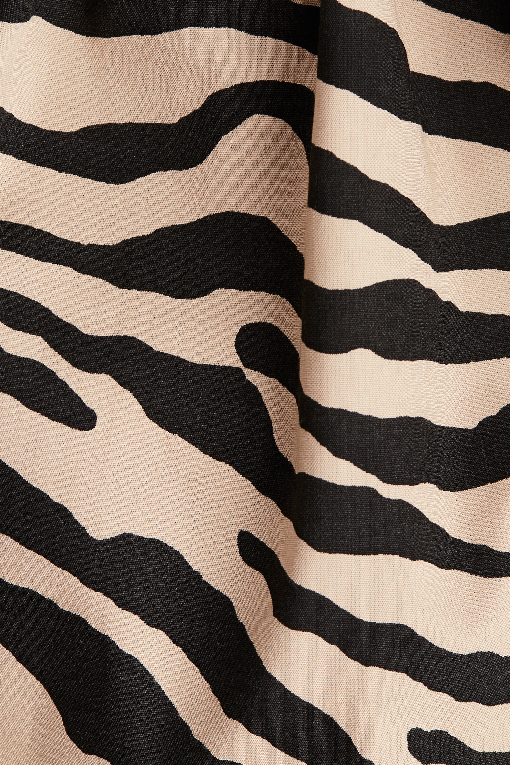 Abito a spalle scoperte in tessuto di cotone. Ampio volant con elastico rivestito e bordo di silicone in alto. Lunghezza al polpaccio. Corpetto aderente, cerniera nascosta su un lato e gonna svasata. Sfoderato.
