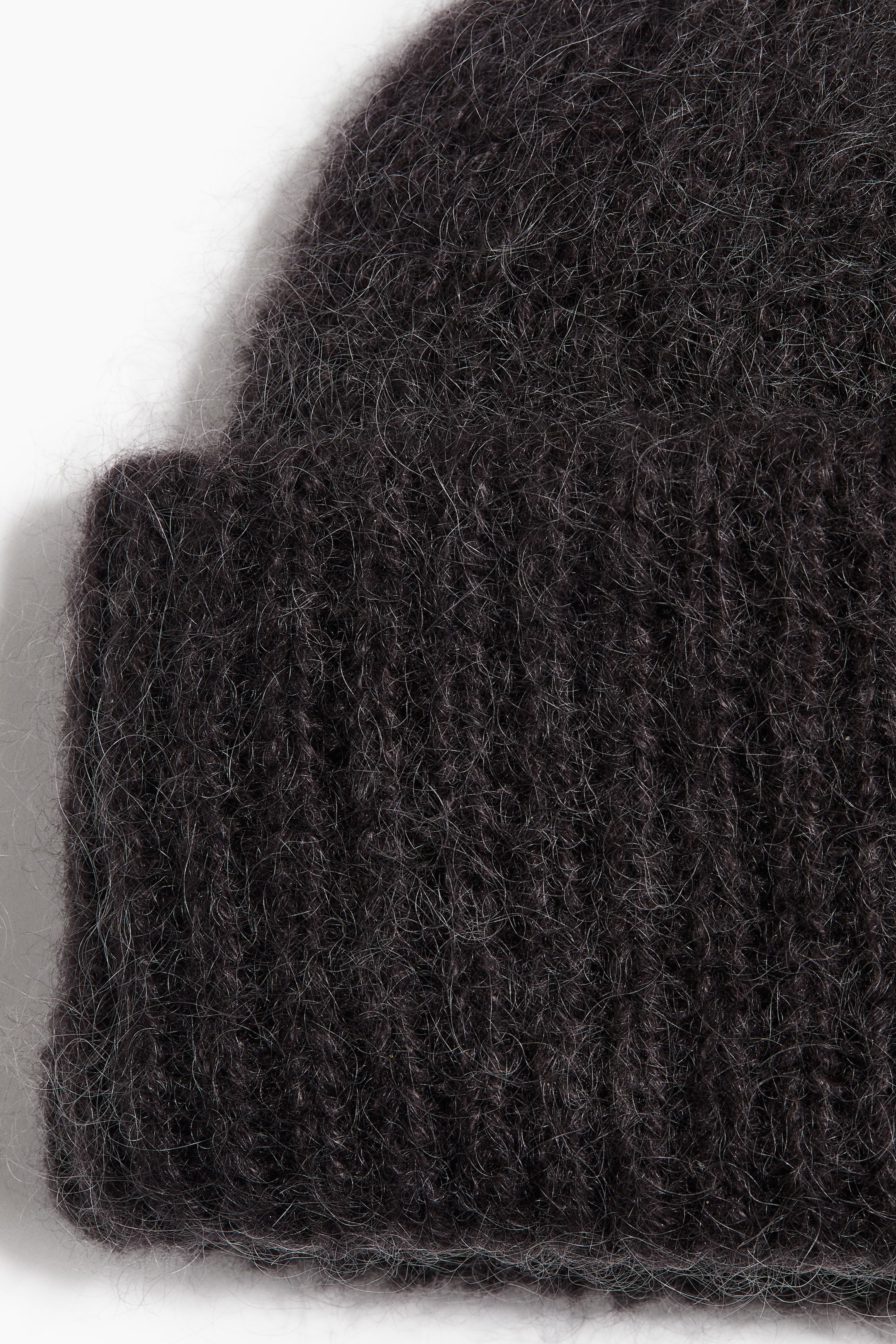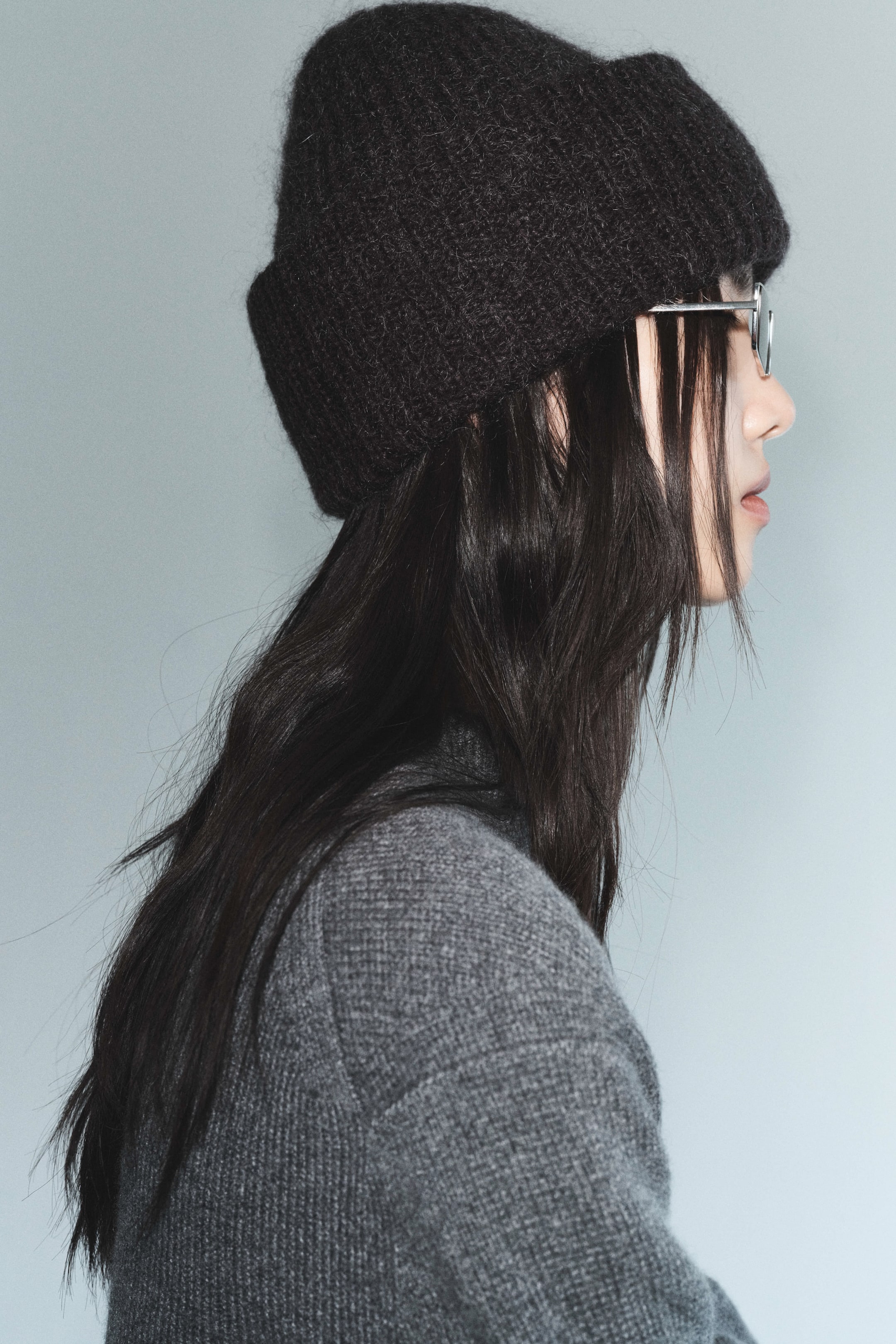 Berretto in maglia a coste di morbido mohair e lana. Alto risvolto doppio in basso.
