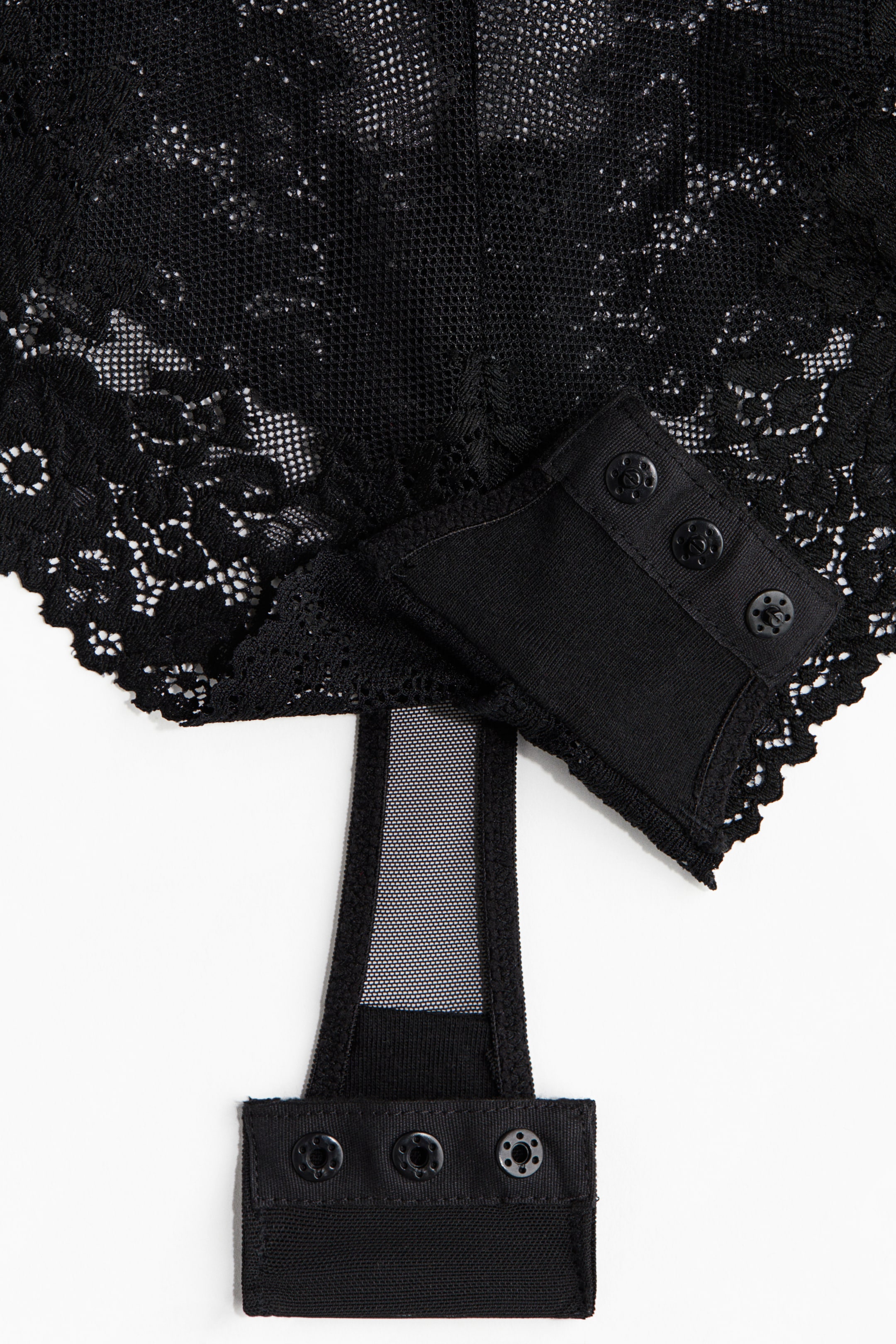 Body a perizoma in pizzo e tulle con reggiseno push-up. Spalline regolabili e coppe imbottite con ferretto che valorizzano il seno e rendono il décolleté più abbondante. Allacciatura con gancetti dietro. Tassello foderato con bottoni automatici nascosti.