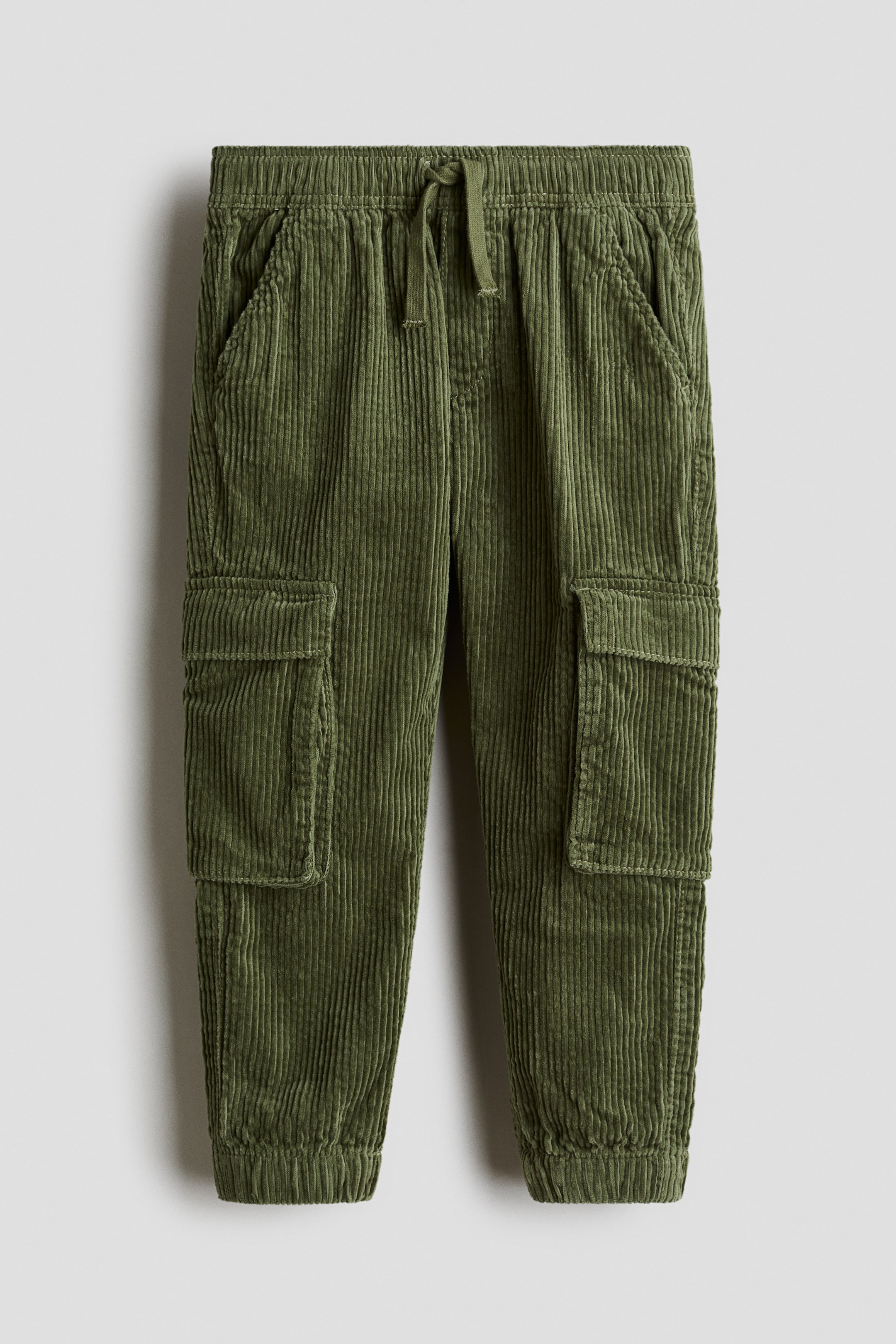 Joggers stile cargo in morbido velluto a coste di cotone. Vita elasticizzata con coulisse, tasche laterali oblique, finta patta. Tasche con pattina sulle gambe, tasca con pattina dietro. Elastico rivestito a fondo gamba.