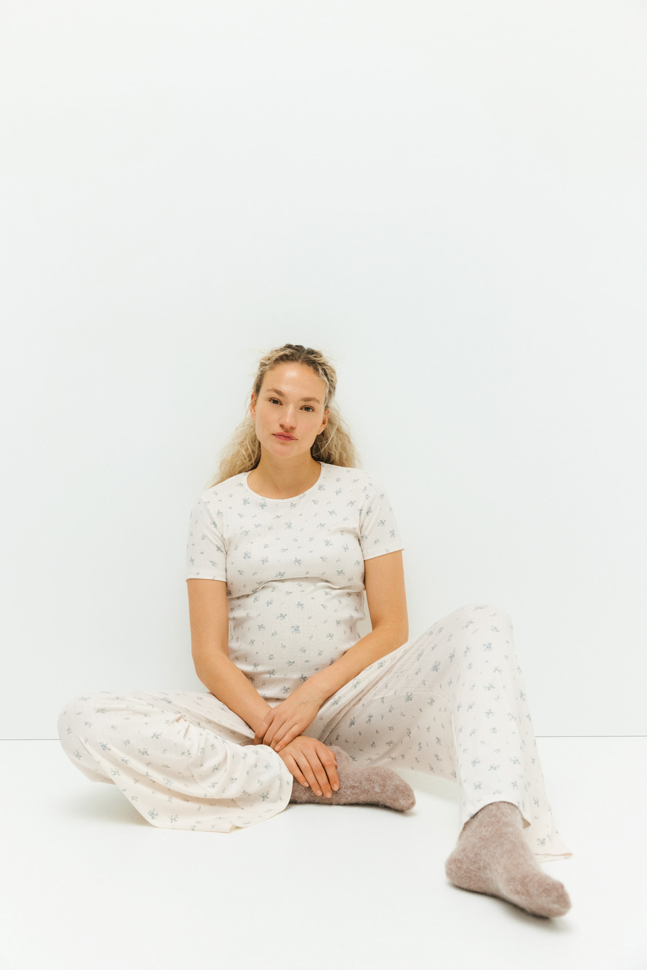 Pigiama composto da T-shirt e pantaloni in morbido jersey traforato. T-shirt con scollo rotondo e bordino sottile. Pantaloni con elastico in vita e gamba ampia.