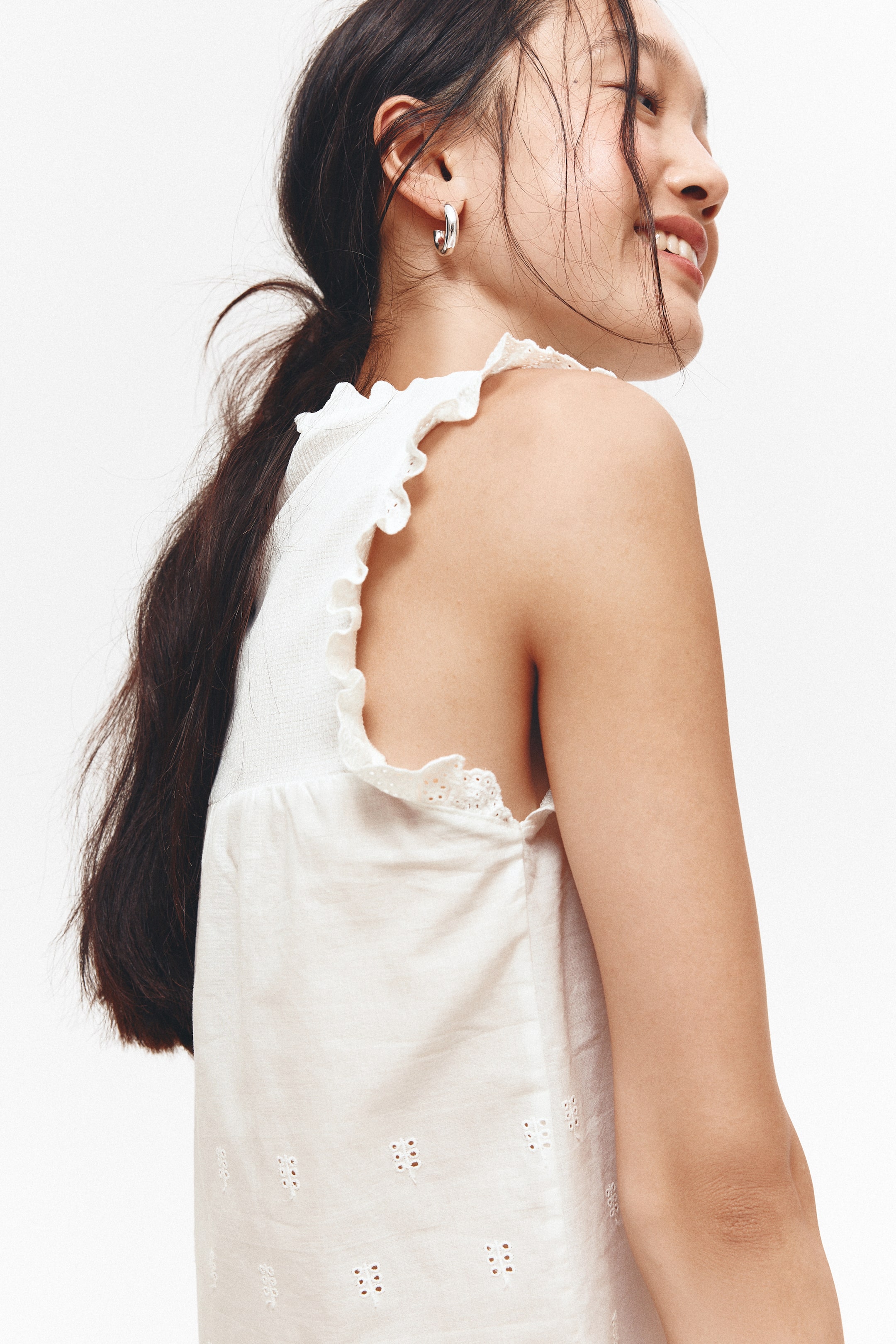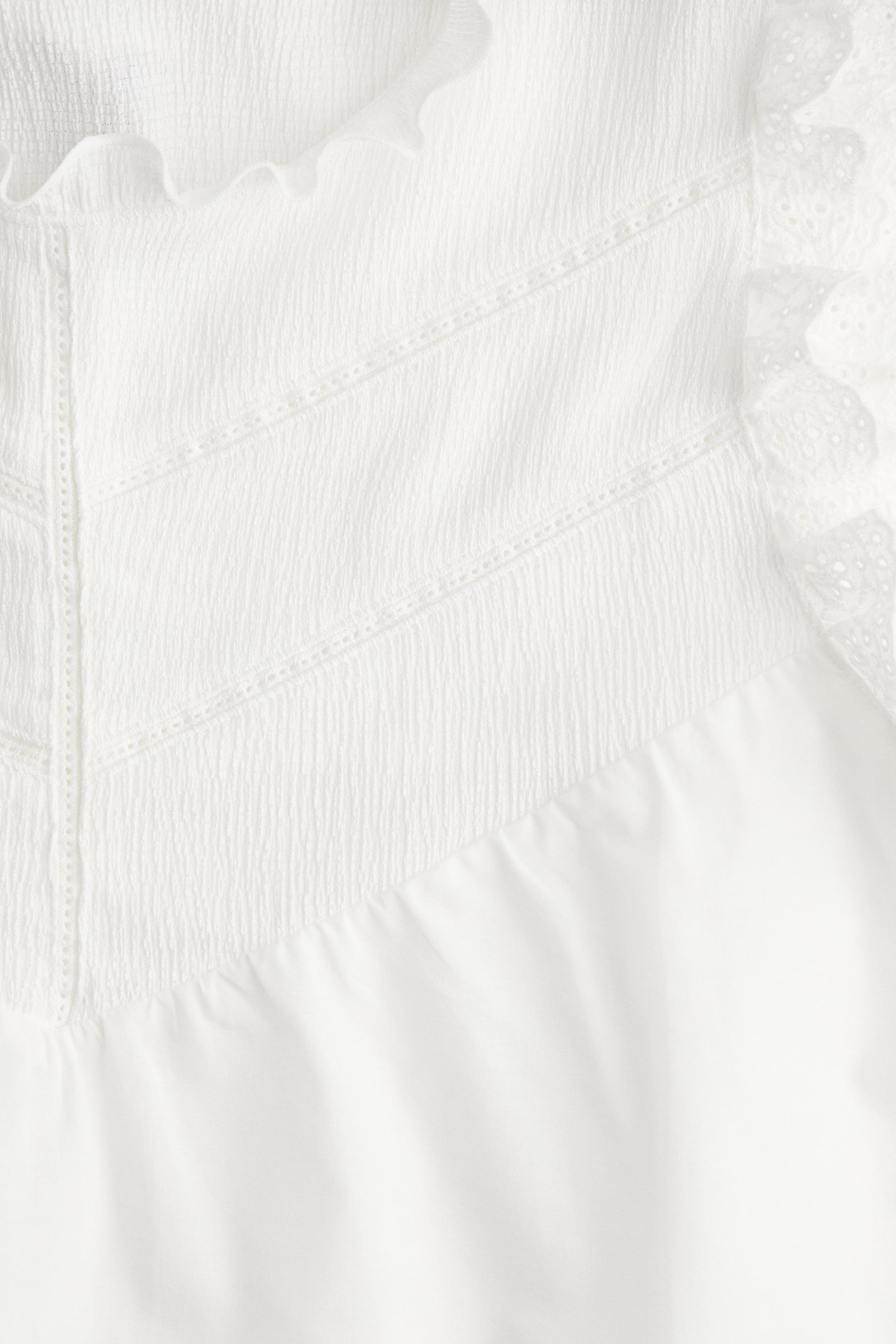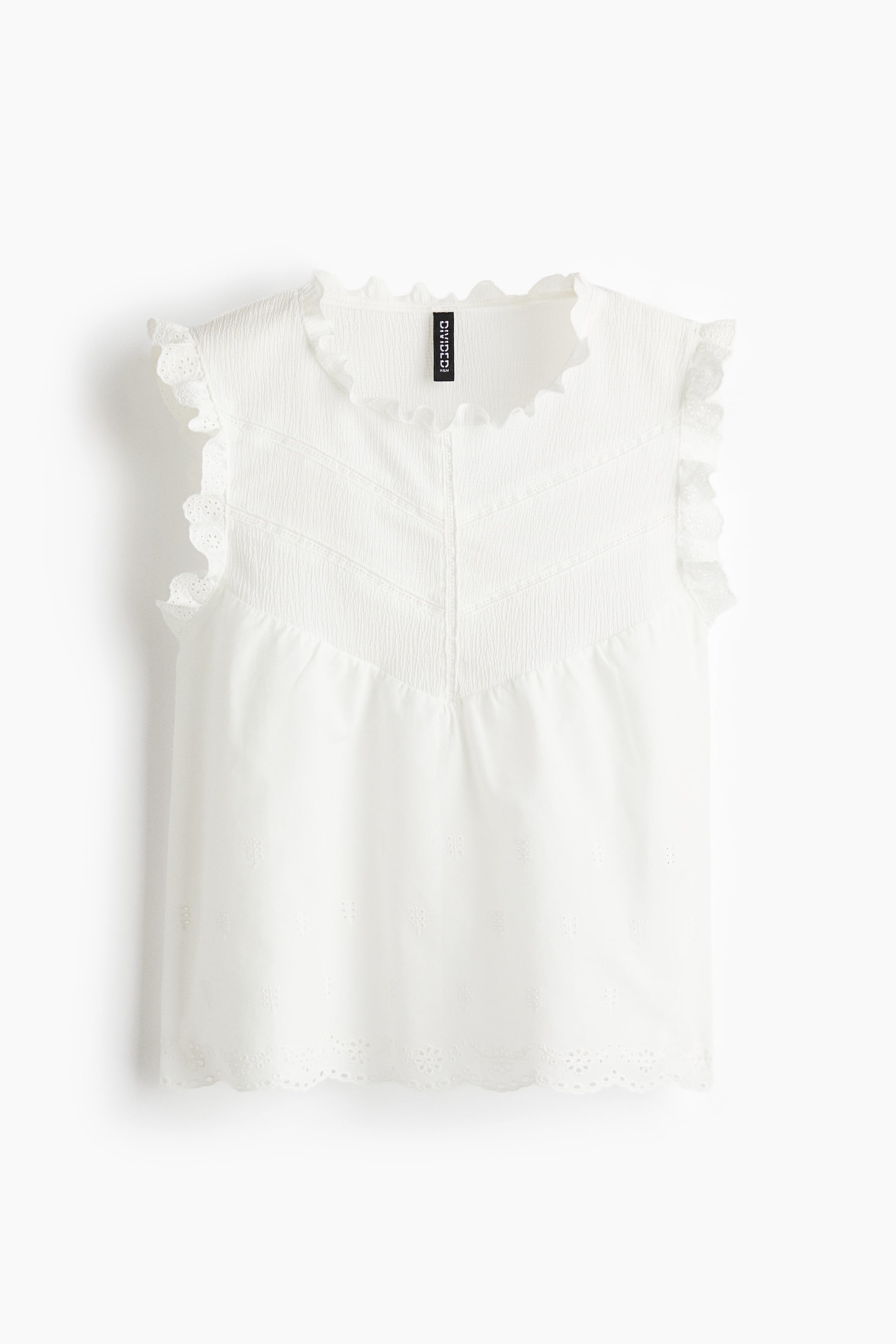 Canotta corta e ampia in tessuto di cotone. Carré in jersey goffrato davanti e dietro, inserti in pizzo a punto smagliato davanti. Modello girocollo con bordo a volant in alto, volant sul giromanica con pizzo sangallo. Bordo smerlato in basso con sangallo.