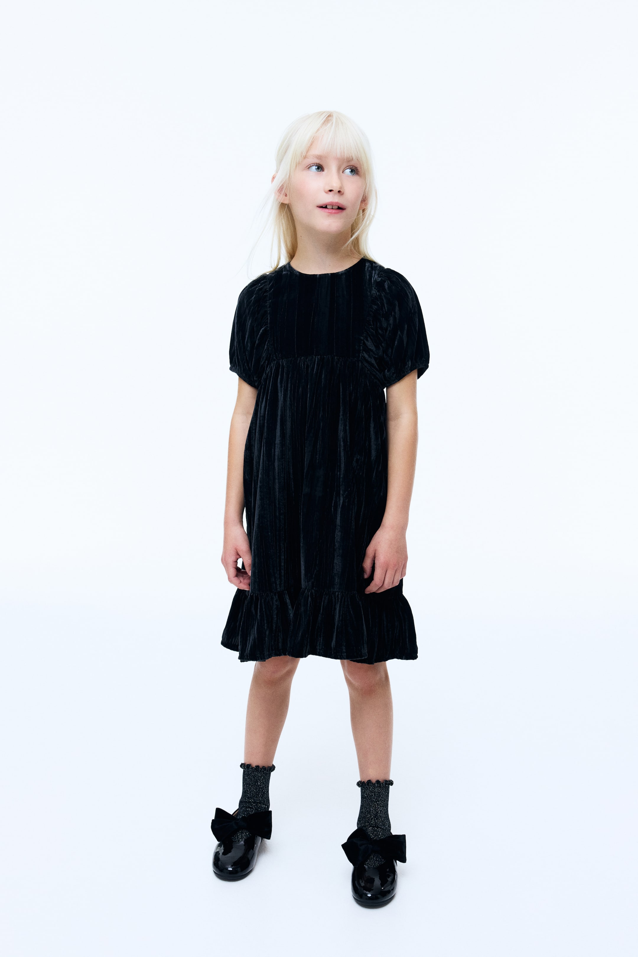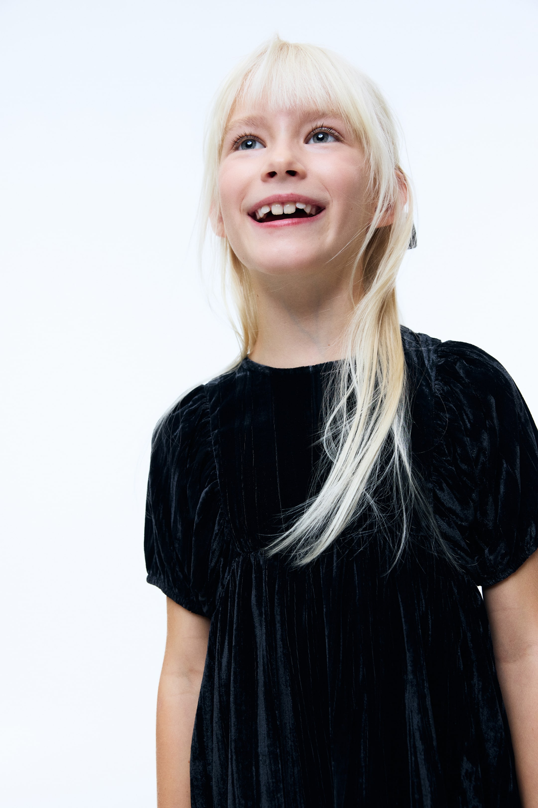 Abito in morbido velluto riccio con scollo rotondo. Bottoni dietro, maniche corte a sbuffo con elastico in fondo. Cucitura arricciata in vita e sopra il bordo inferiore. Foderato.
