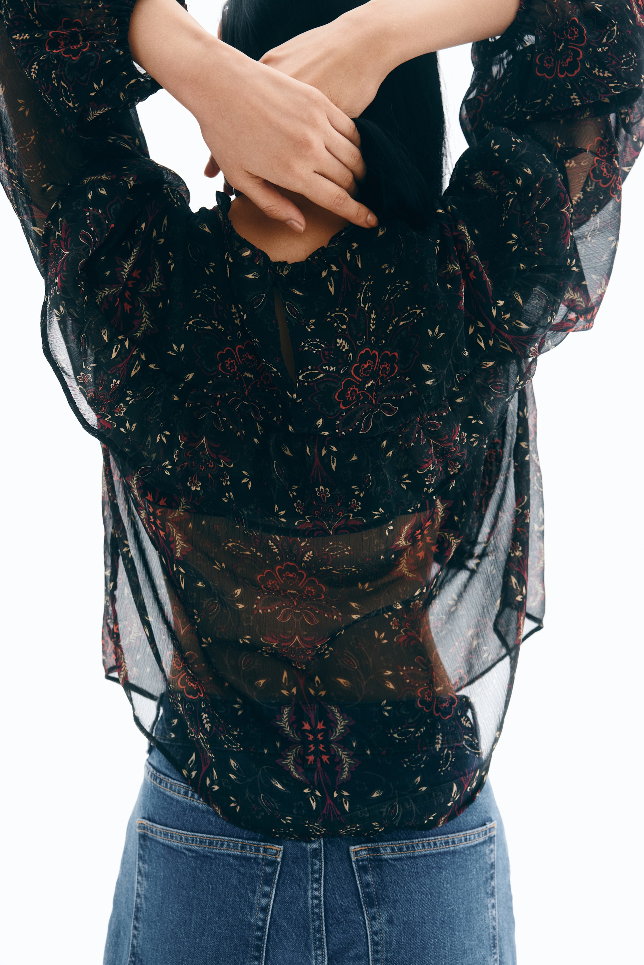 Camicetta dalla linea ampia in chiffon trasparente. Colletto a volant, apertura a goccia con bottone nascosto dietro. Carré con volant davanti e dietro, maniche lunghe a palloncino con polsini elasticizzati.