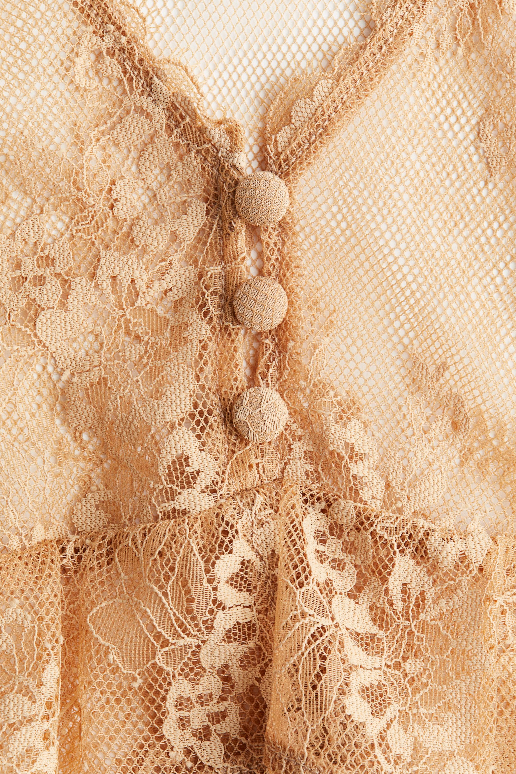 Top con spalline sottili in pizzo trasparente. Profondo scollo a V e bottoni rivestiti davanti. Volant sotto il seno e due volant in basso. Sfoderato.