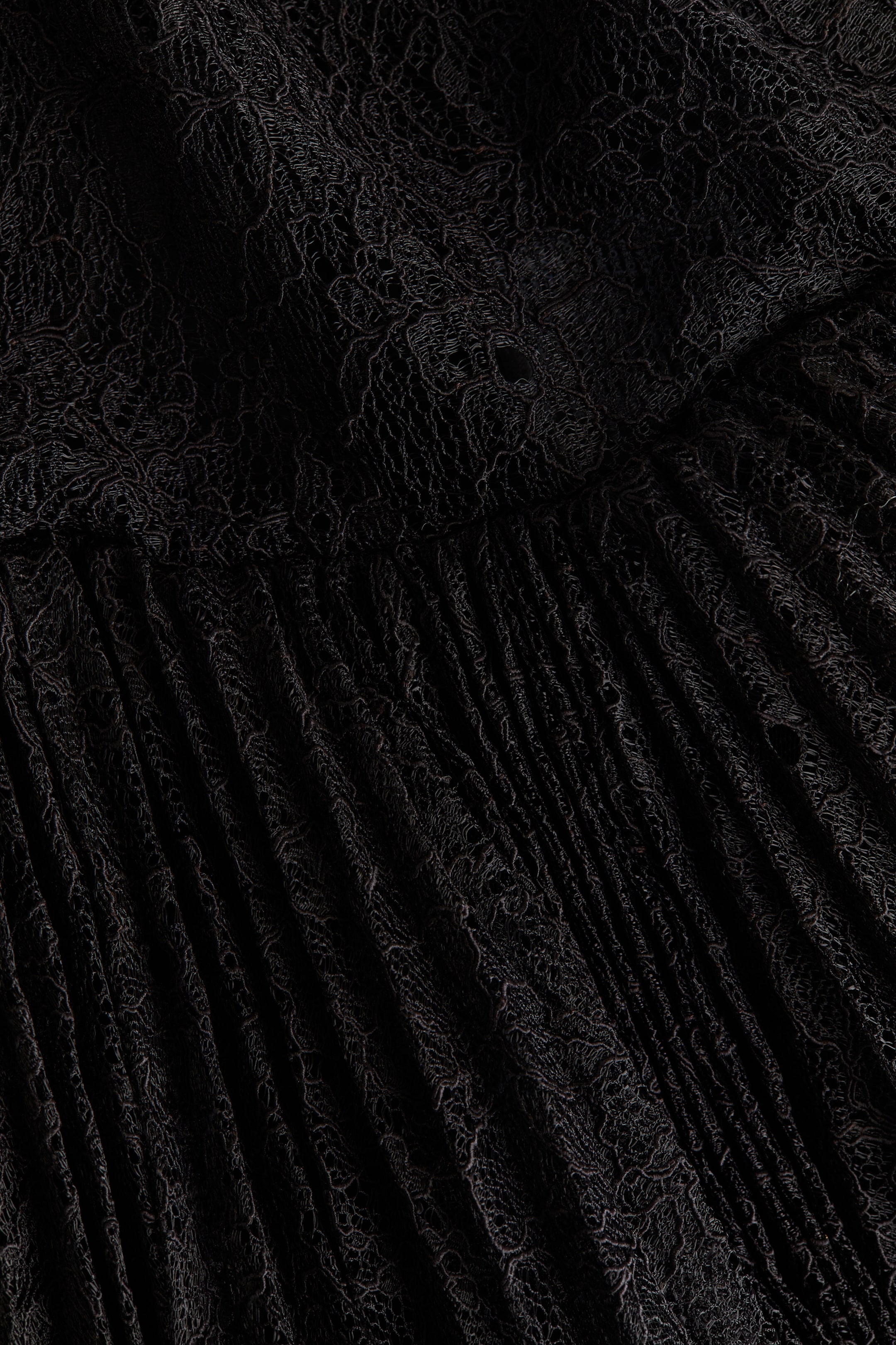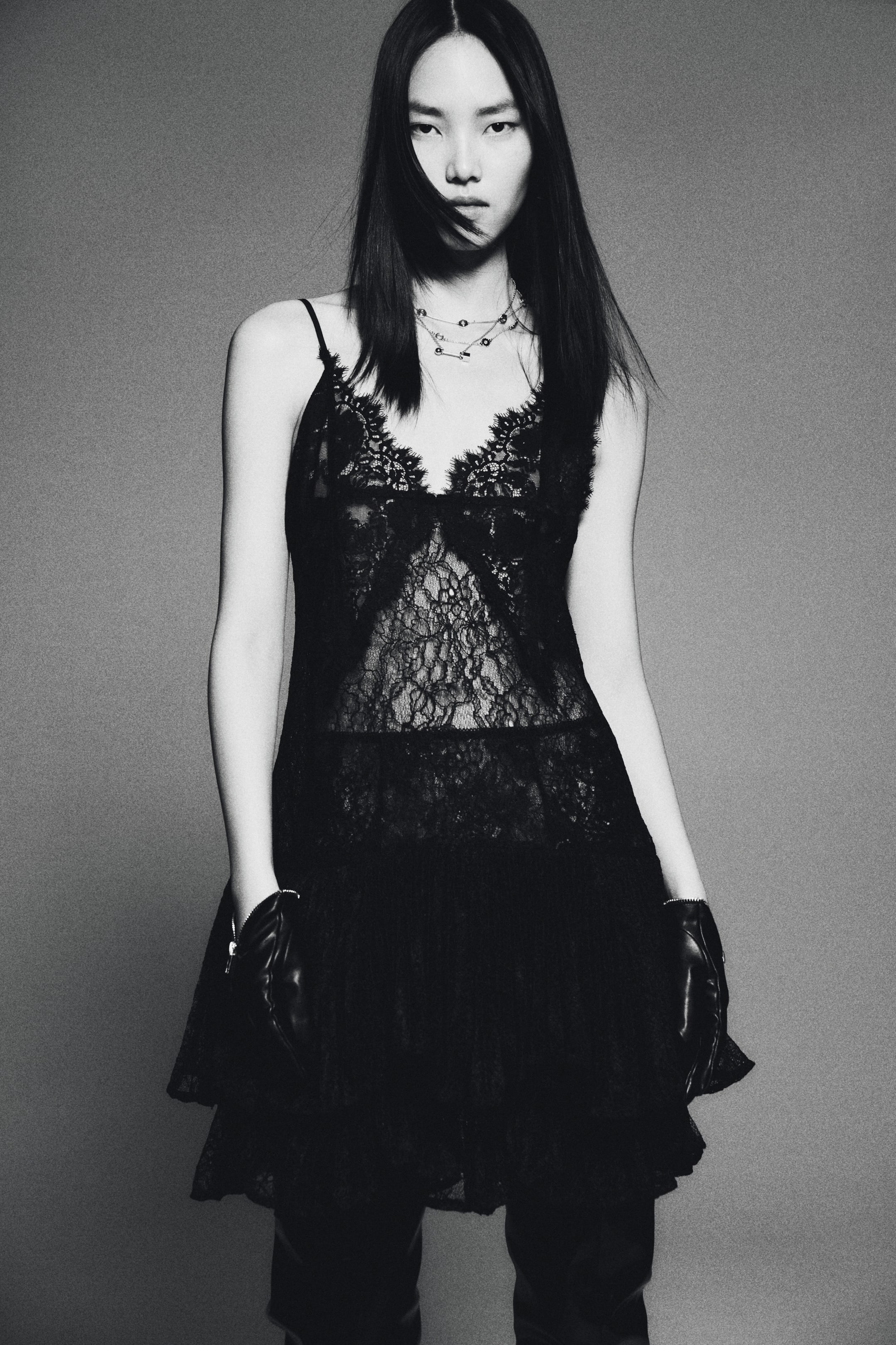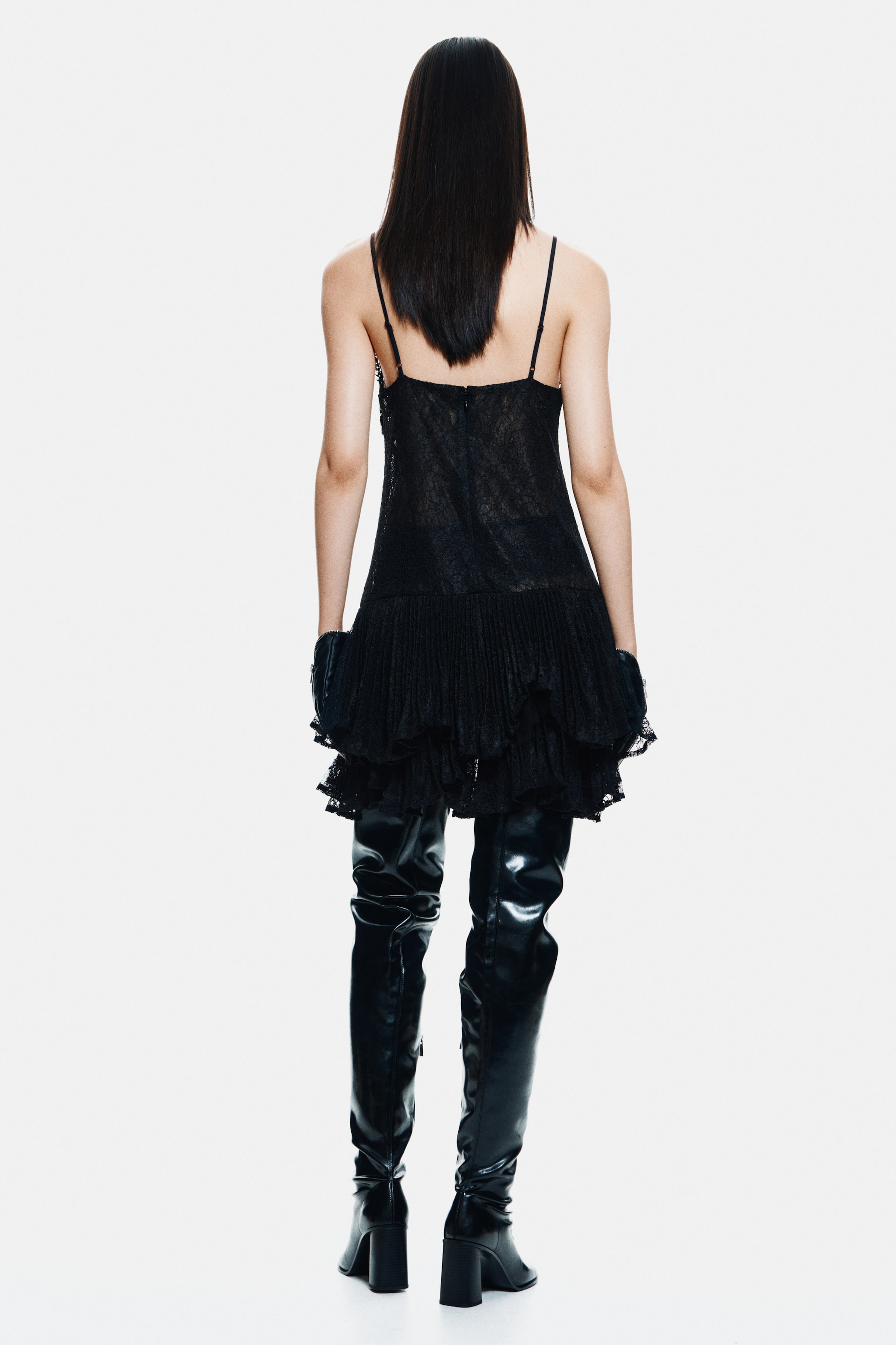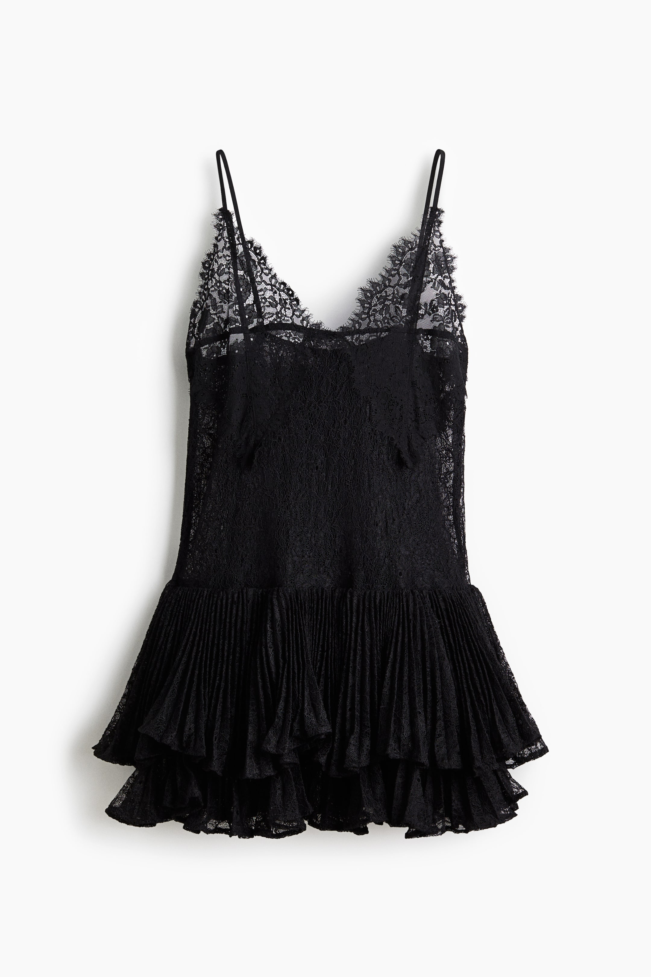 Abito corto in pizzo trasparente. Spalline sottili e regolabili, profondo scollo a V sul davanti. Cerniera e gancetto nascosti dietro. Doppi volant in pizzo a pieghe in basso.