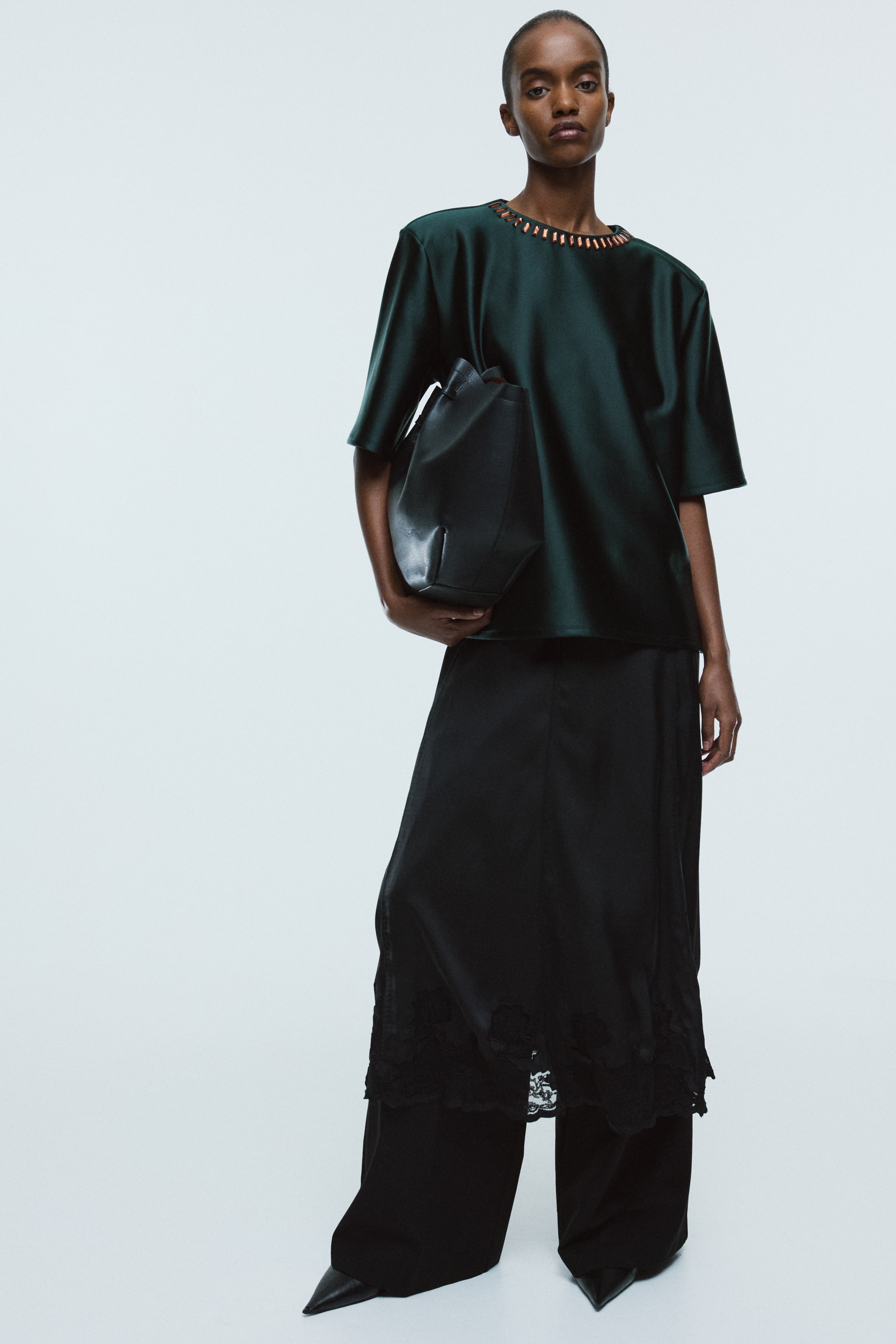 Top dalla linea ampia in pesante jersey semilucido. Scollo rotondo con decorazioni, spalle imbottite e maniche al gomito. Cerniera nascosta dietro, bordo dal taglio dritto in basso con spacchi laterali.