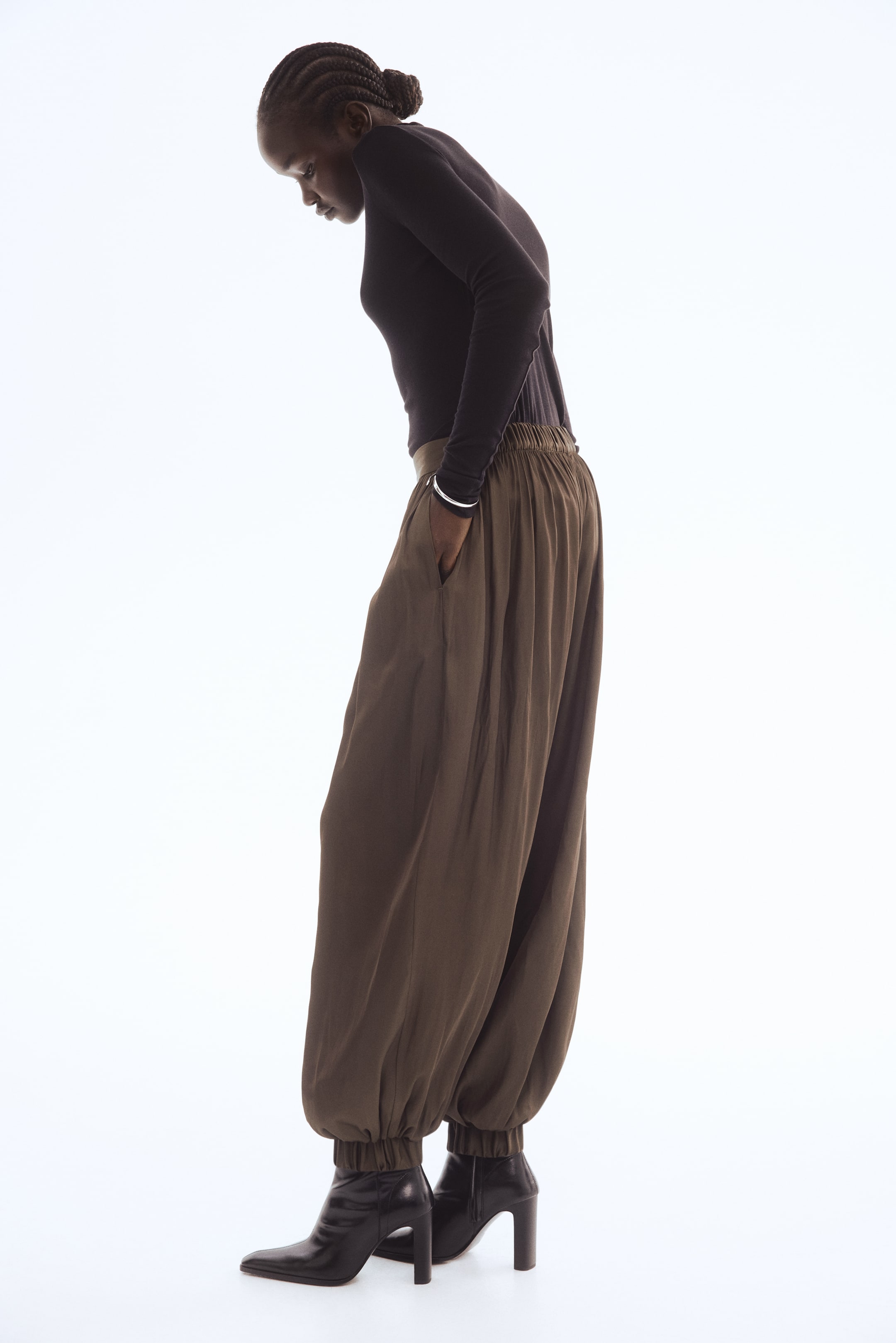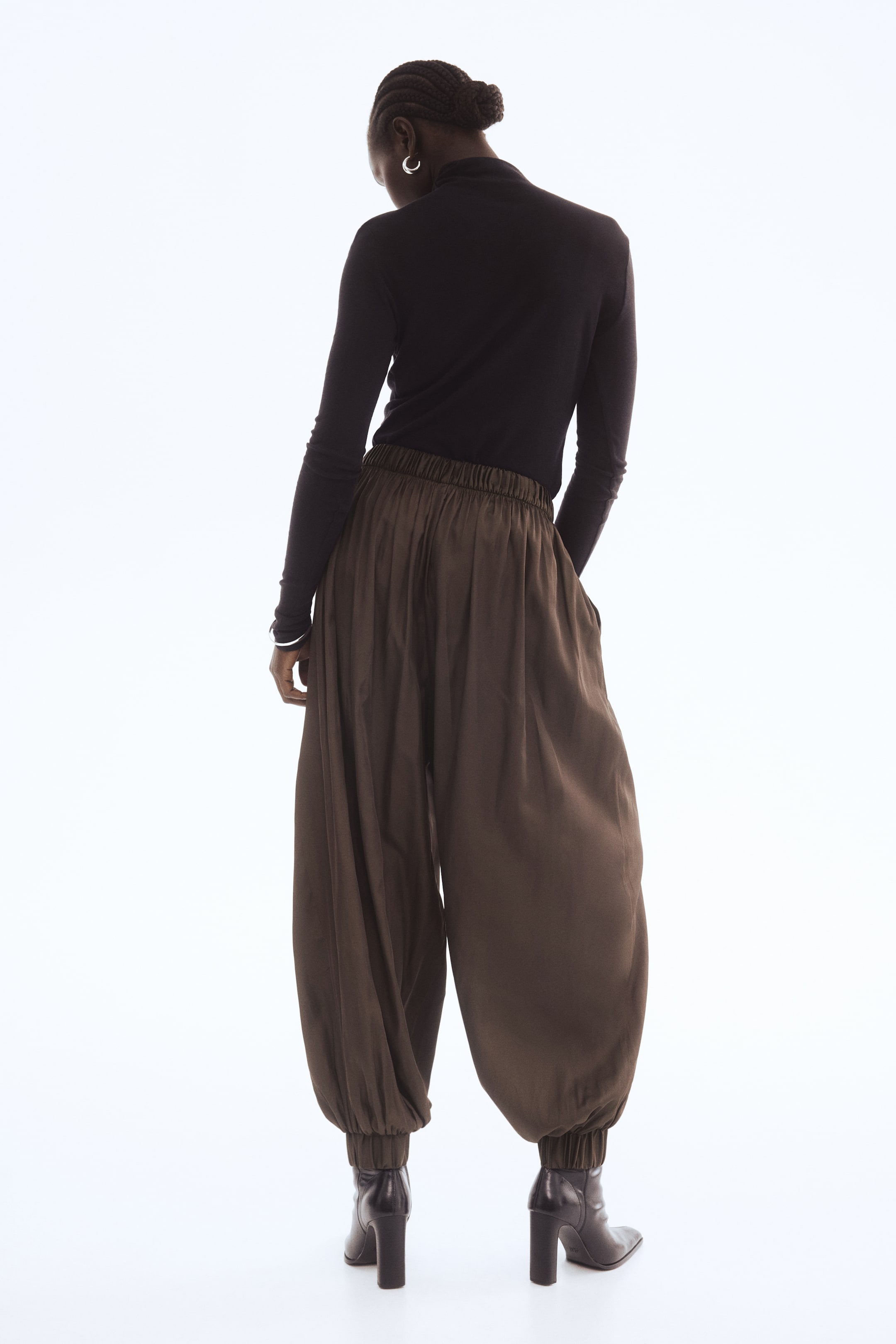Pantaloni dalla linea ampia in morbido satin drappeggiato, lunghezza alla caviglia. Elastico in vita, gamba a palloncino ed elastico in fondo.