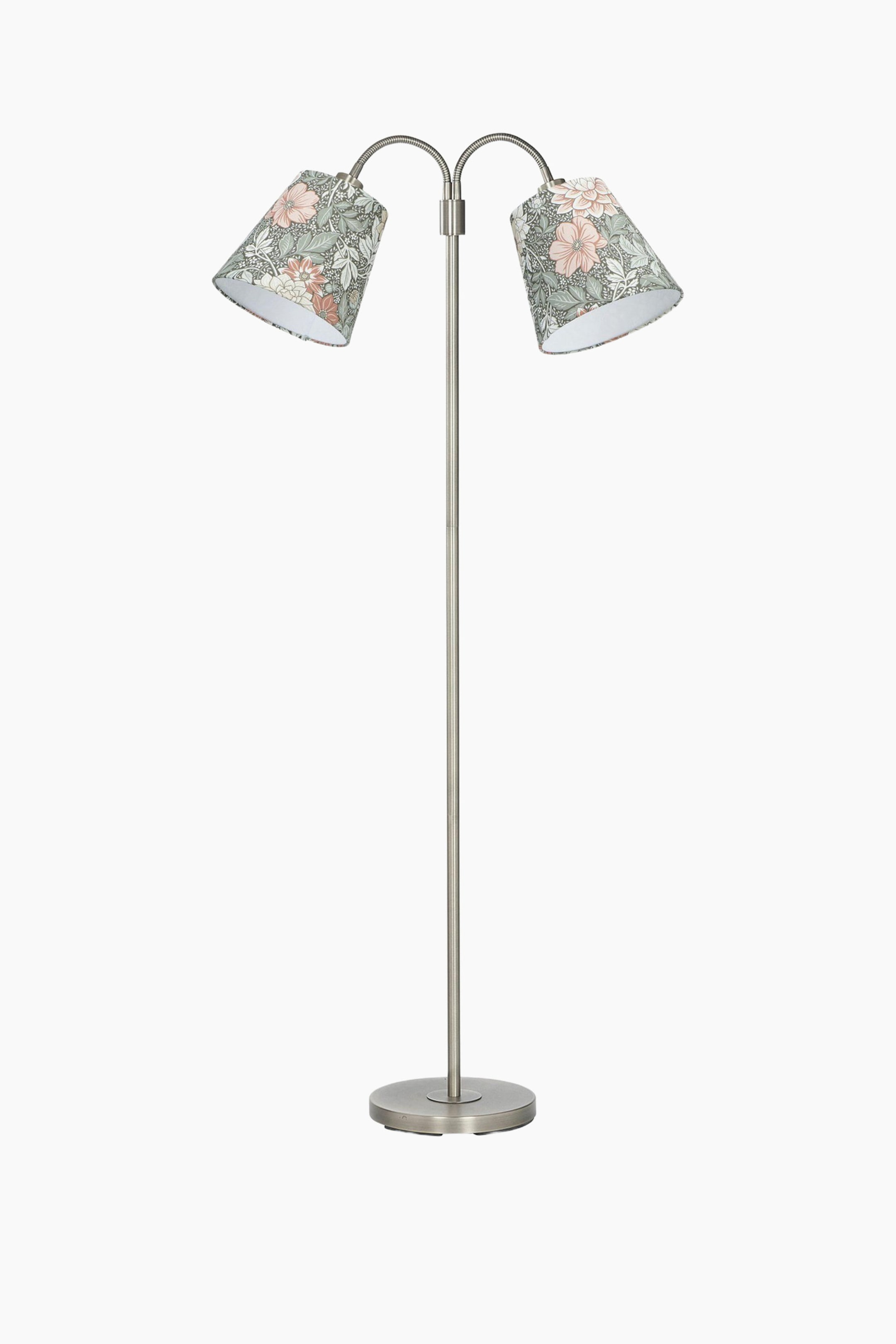 Una semplice e classica lampada da terra in metallo con due bracci regolabili, con paralume Dahlia Garden in una combinazione di colori verde/rosa tenue. Un motivo dipinto a mano dalla designer Jenny Hahne Gadd per Boråstapeter. Lascia che i magnifici dahlia e le foglie aggraziate entrino nella tua stanza. La lampada da terra ha un'altezza di 150 cm e un cavo di 190 cm, con presa a muro e interruttore su uno dei bracci. E27, max 25W. La lampada viene consegnata in versione da assemblare e facile da montare. Il paralume ha un diametro di 20 cm alla base, 13 cm in alto e un'altezza di 19 cm. Realizzato al 100% in poliestere riciclato, stampato a Borås, Svezia.