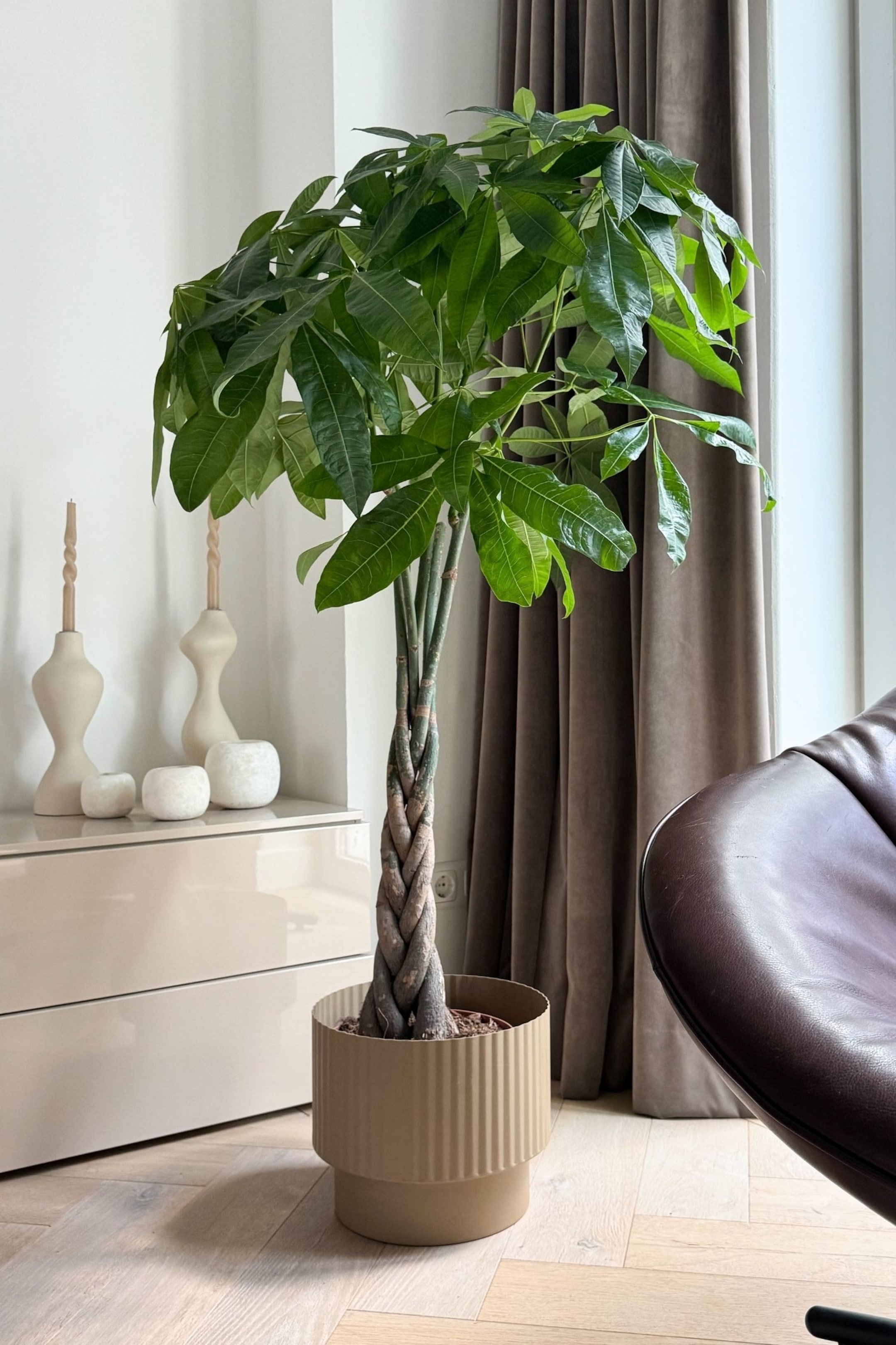 Con le sue grandi foglie e i fusti intrecciati, la Pachira è una pianta bella e particolare. In Asia orientale è considerata, secondo il Feng Shui, portatrice di fortuna e prosperità. Le 5 foglie per ramo simboleggiano i 5 elementi base: metallo, legno, acqua, fuoco e terra. Ha molti soprannomi, tra cui castagna d'acqua o albero dei soldi. Si crede che le sue foglie possano attrarre denaro. È quindi un regalo perfetto per compleanni, inaugurazioni o matrimoni. La pianta viene fornita in un vaso da coltivazione di 24 cm di diametro. Vaso decorativo non incluso. Prodotto non restituibile.