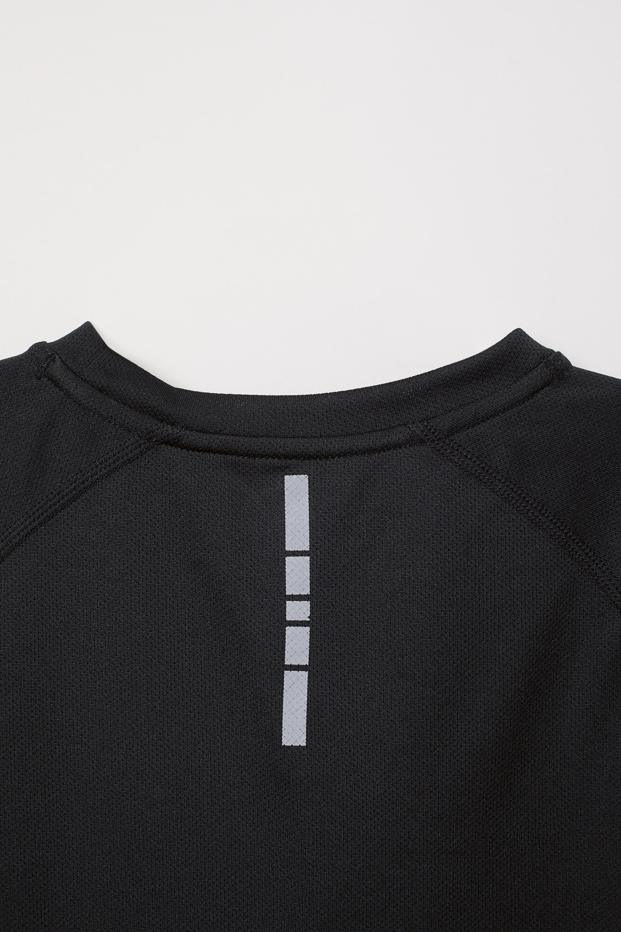 速乾に優れた機能性素材のスポーツトップス。プリントのデザインが施されています。半袖のラグランスリーブ。裾はラウンドカットで、バックのほうが少し長くなったスタイル。