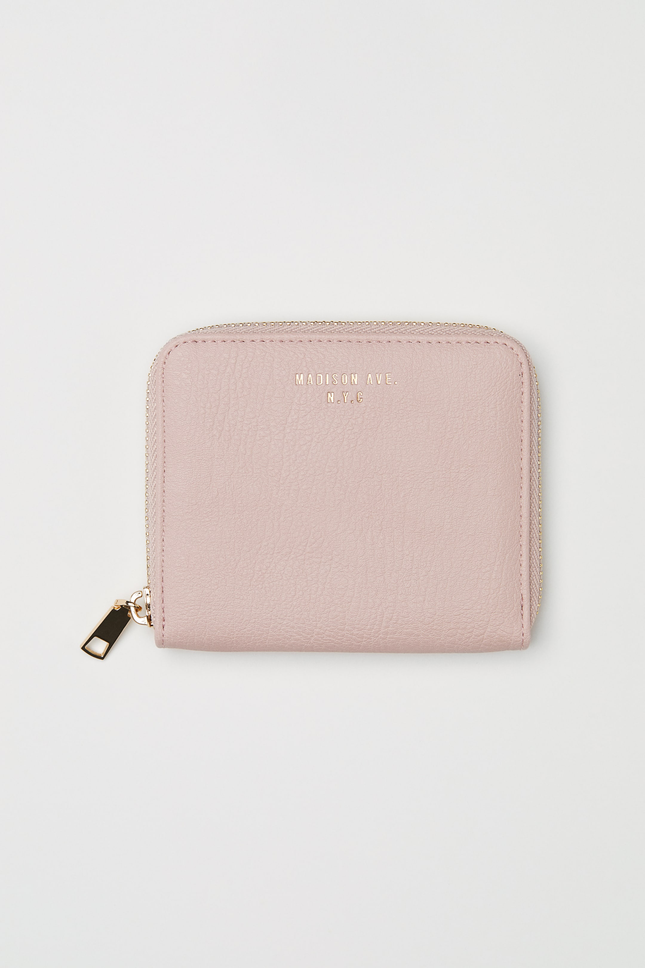 フェイクレザーのウォレット。ラウンドジップタイプ。カードポケット5枚分とジッパータイプのコインポケット1つ付き。裏地付き。サイズ 2x10x11.5cm。
